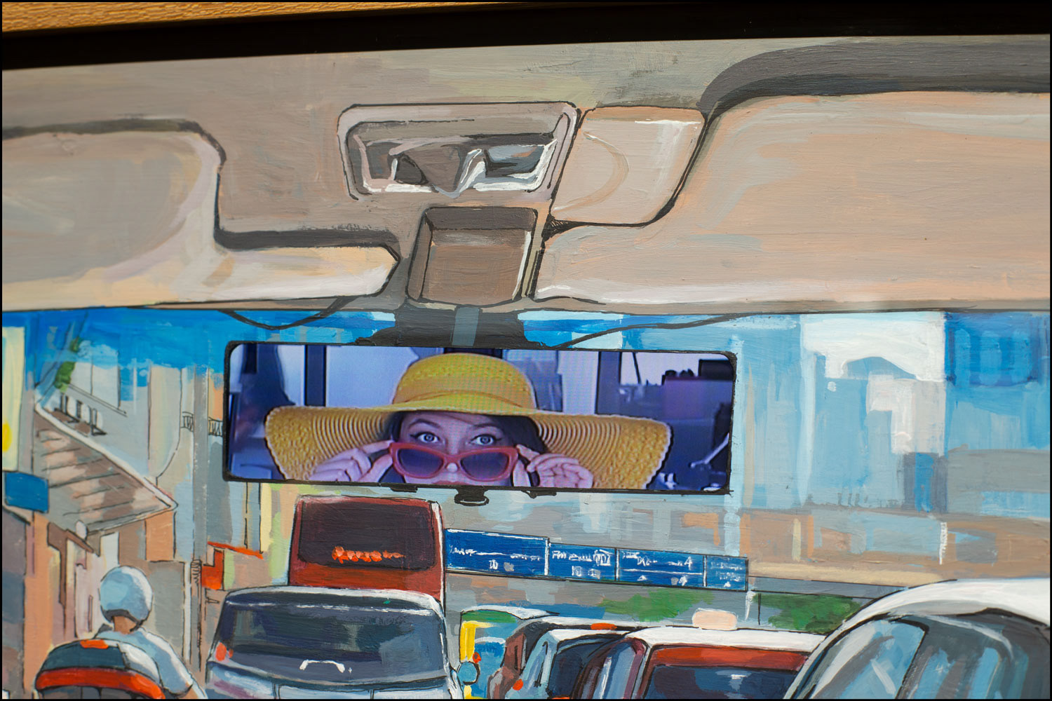 TFT display, CCD camera, acrylic painting on Plexiglass, teakwood frame