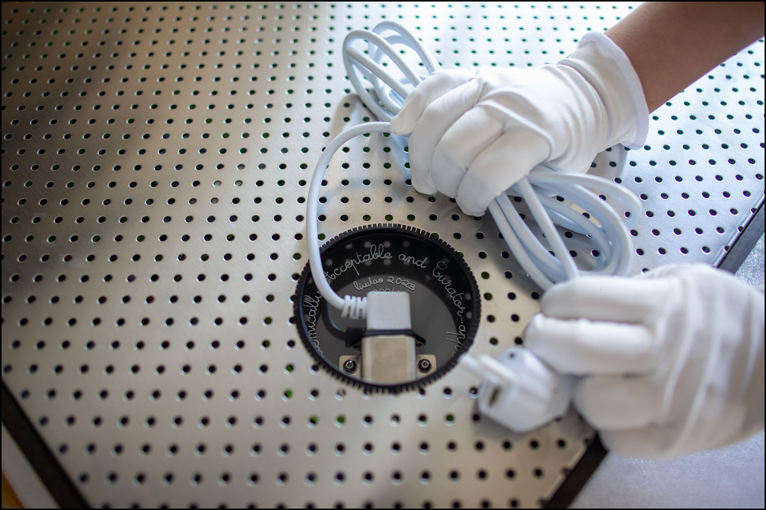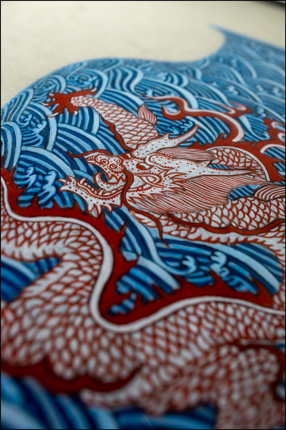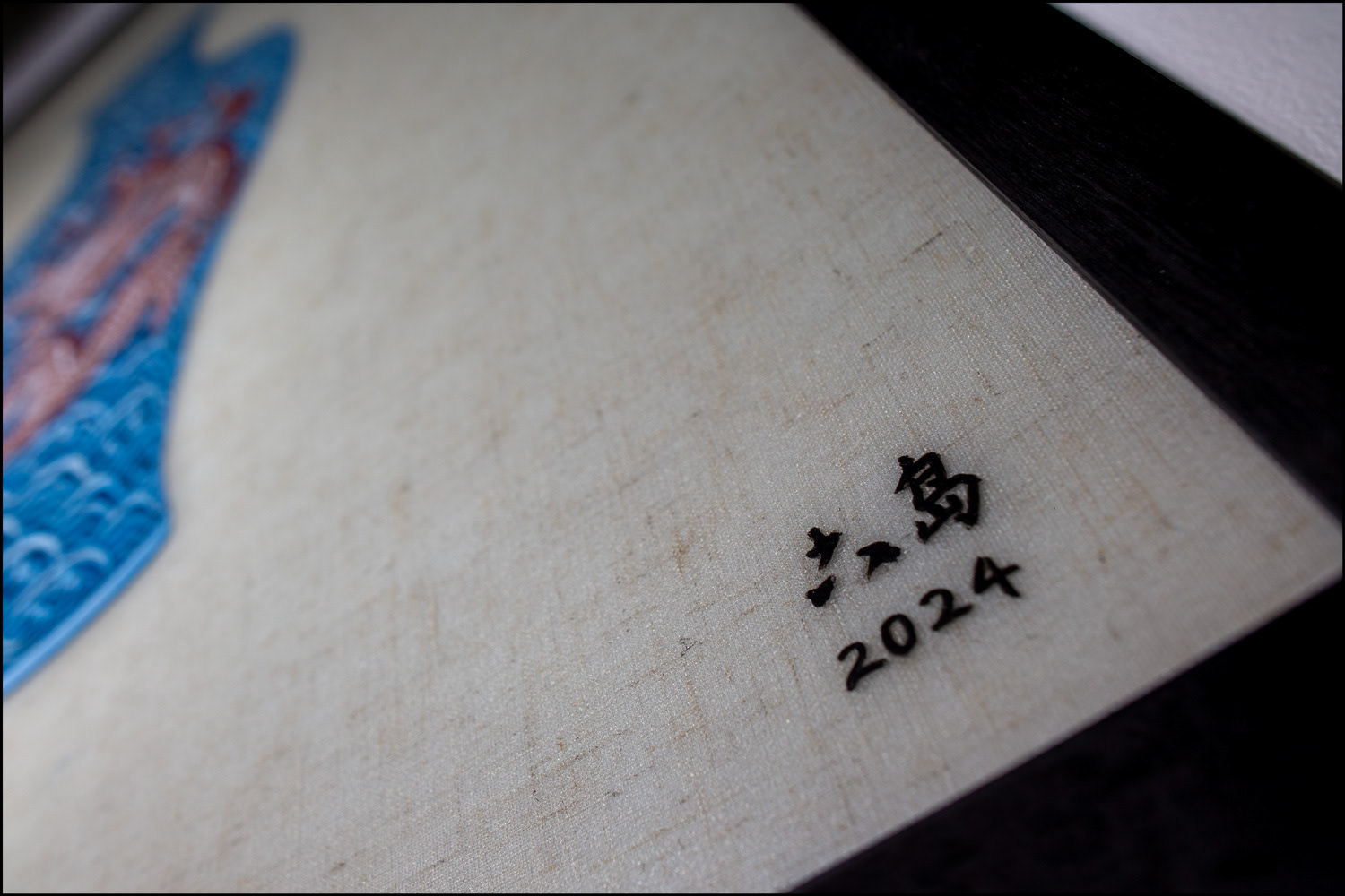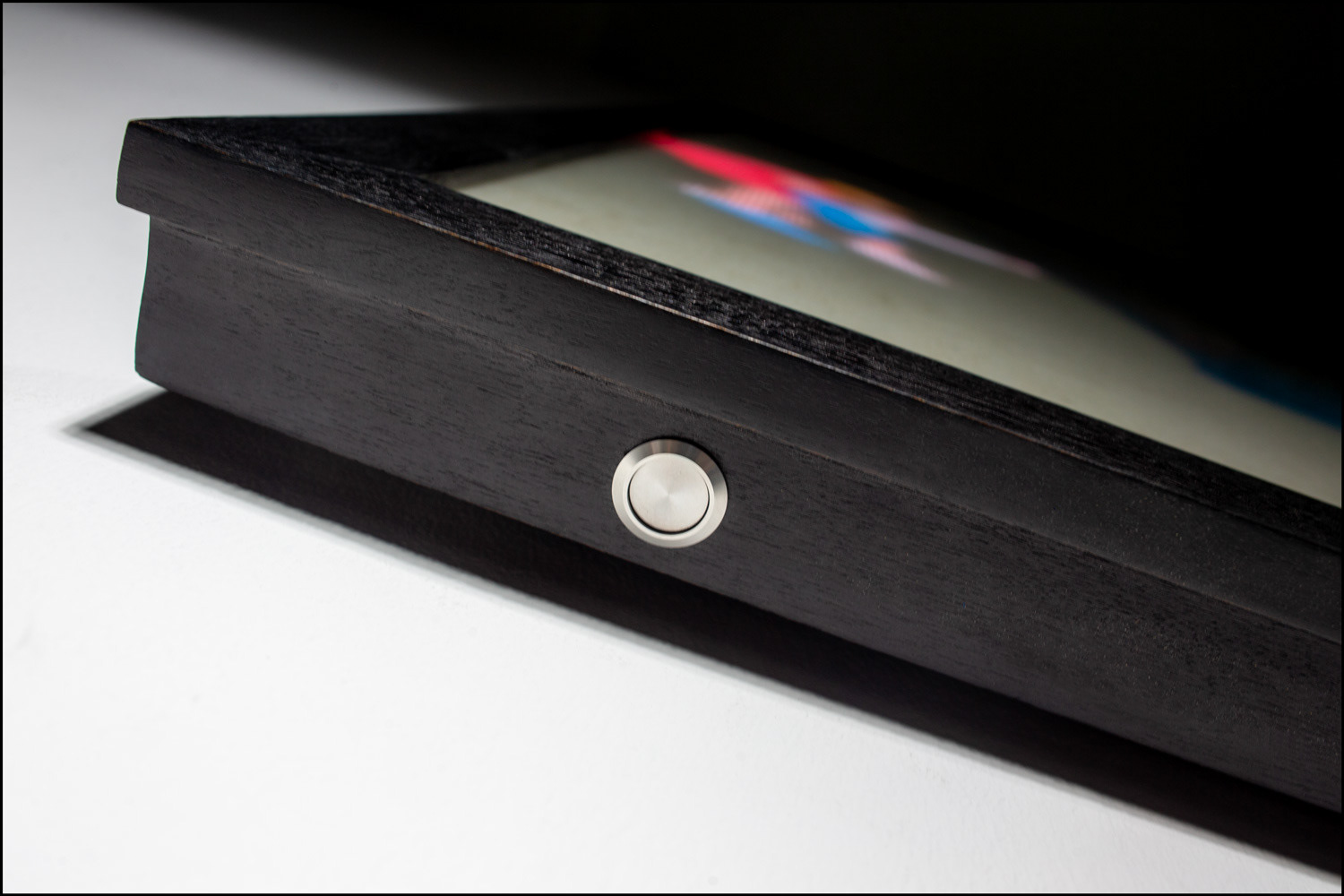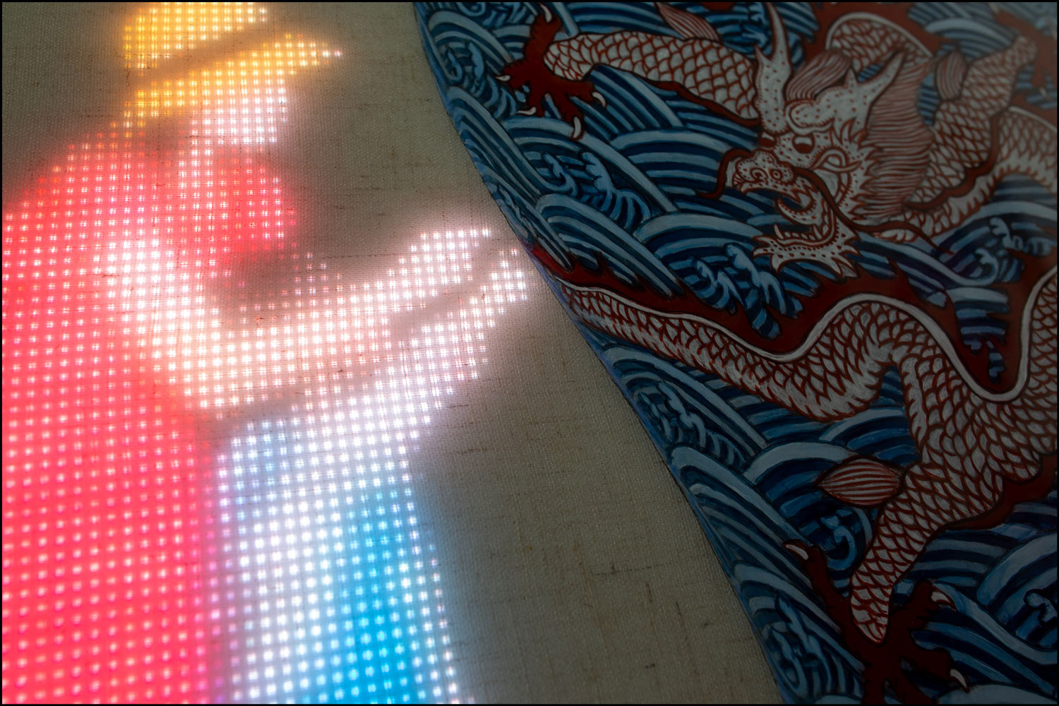 RGB LED display, Staedtler black pigment ink & Pebeo acrylic paint on Vietnamese linen embedded in hand cast resin, black-stained teakwood frame