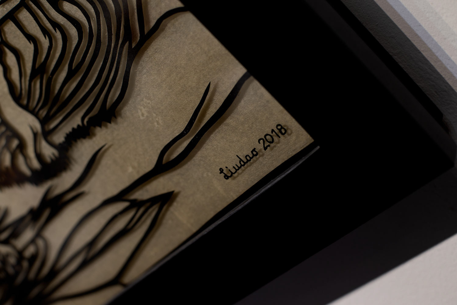 RGB LED display, Chinese papercut (Jian Zhi 剪紙) on Plexiglas, paper collage, Corian & teak frame