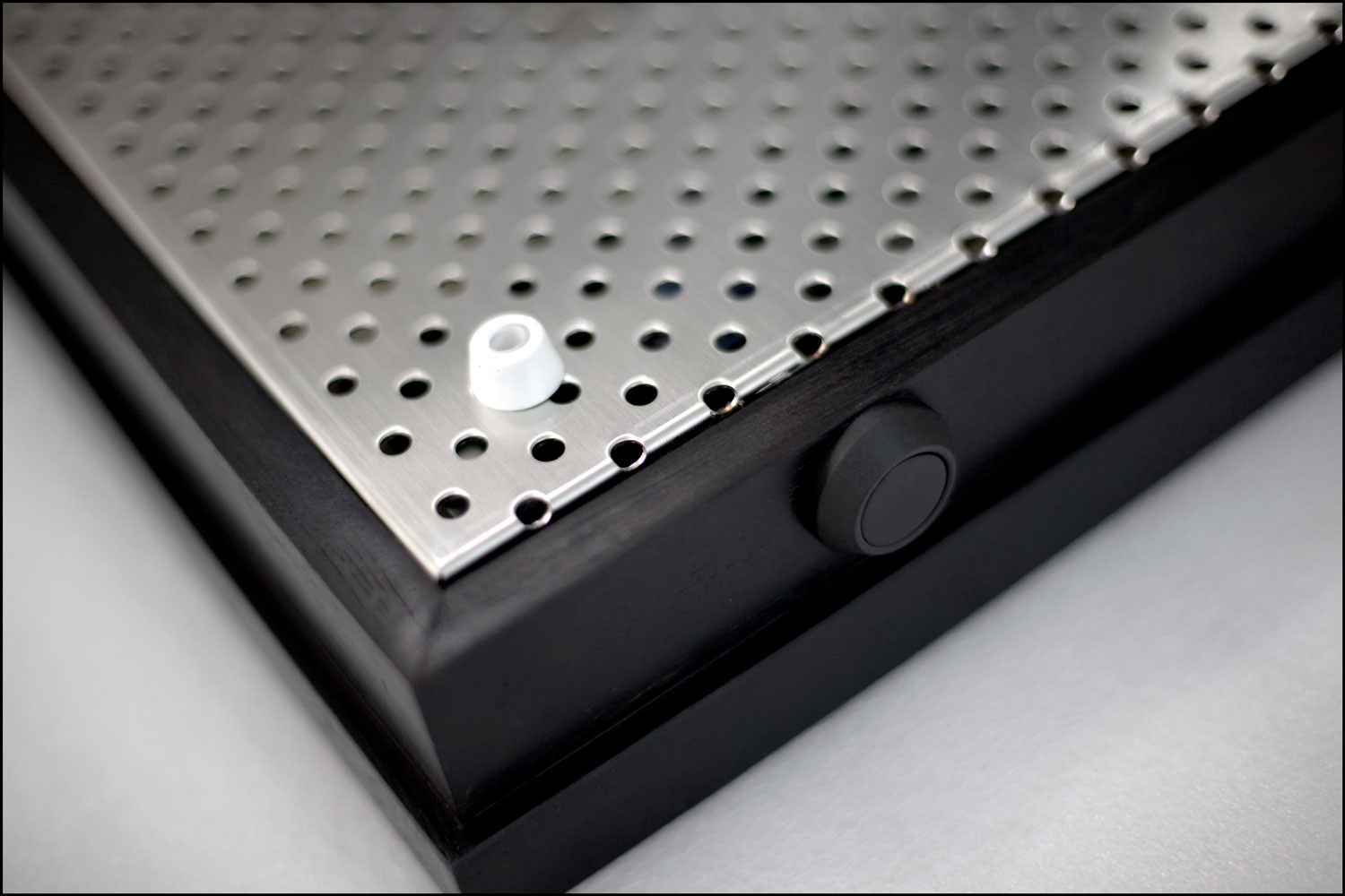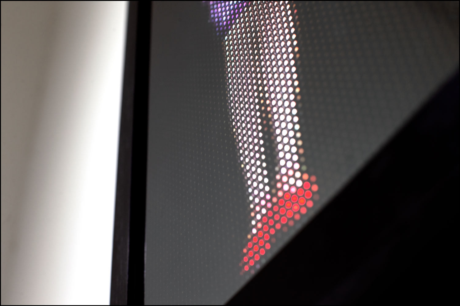 RGB LED display, polarized tempered glass, black-stained teakwood frame