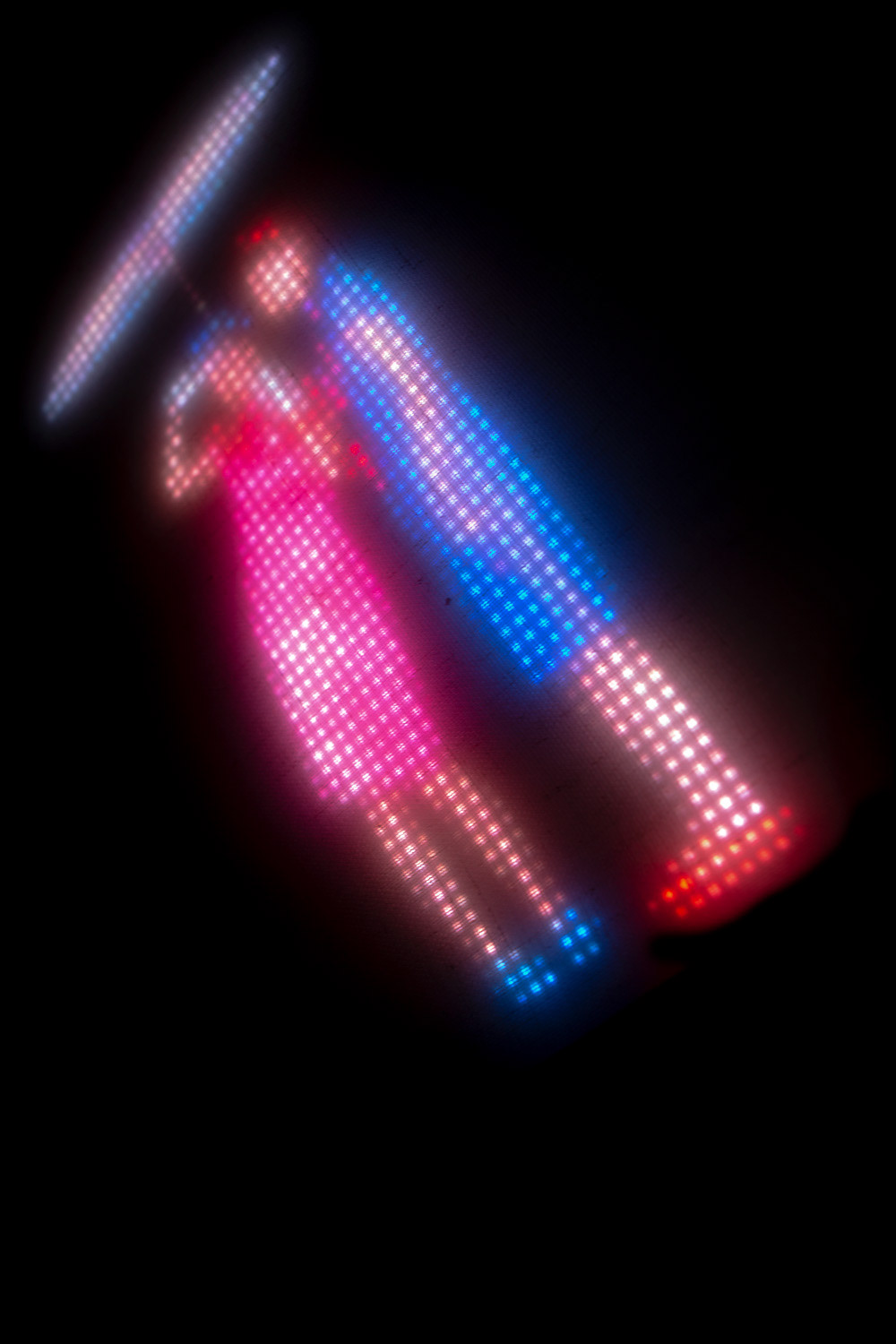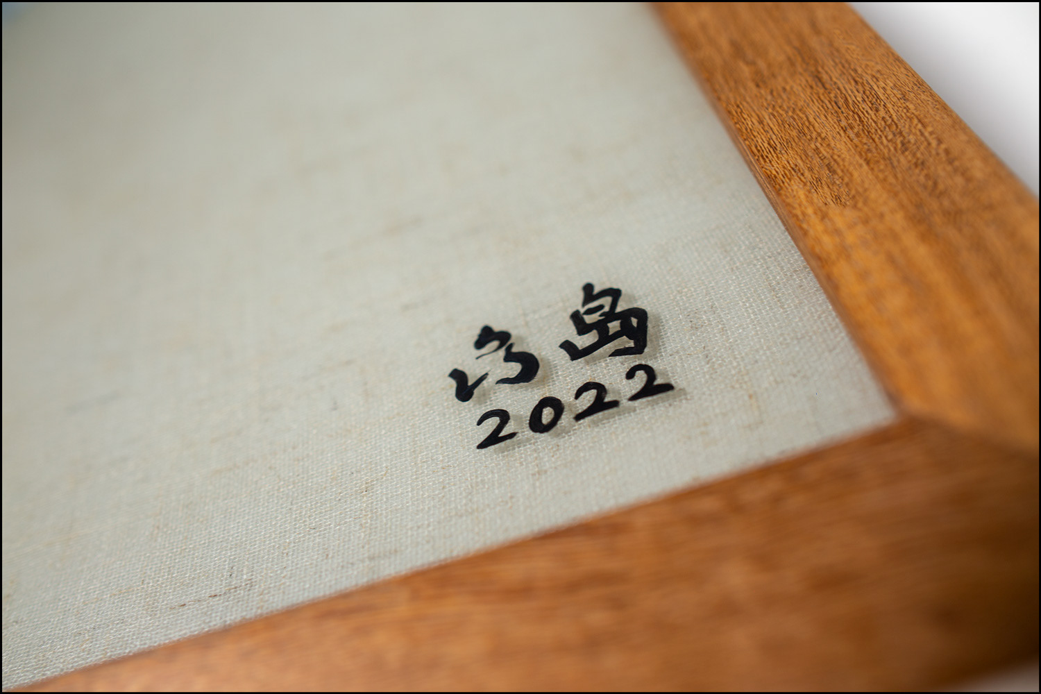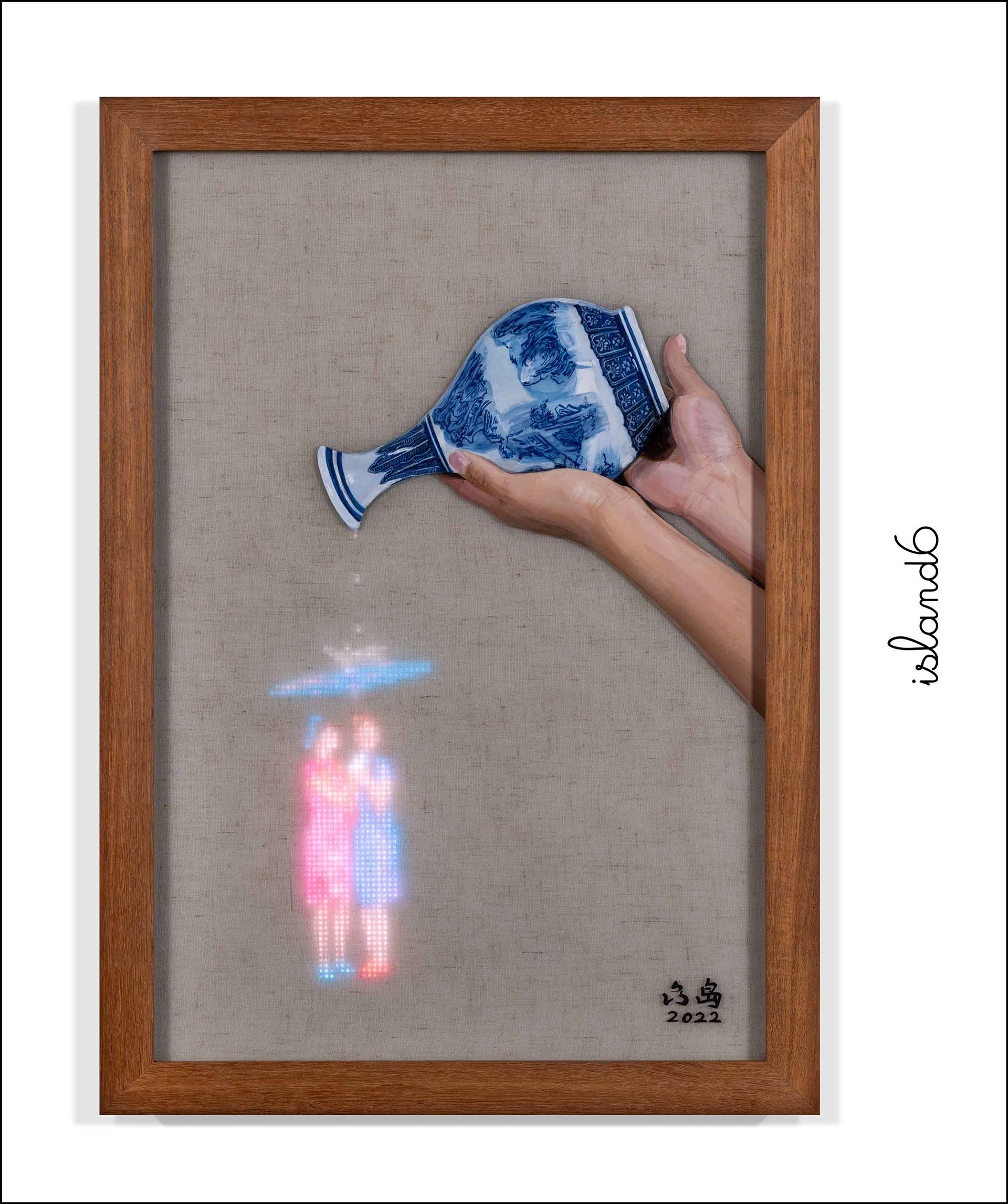 RGB LED display, acrylic painting on Plexiglass, Vietnamese linen embedded in hand cast resin, teakwood frame