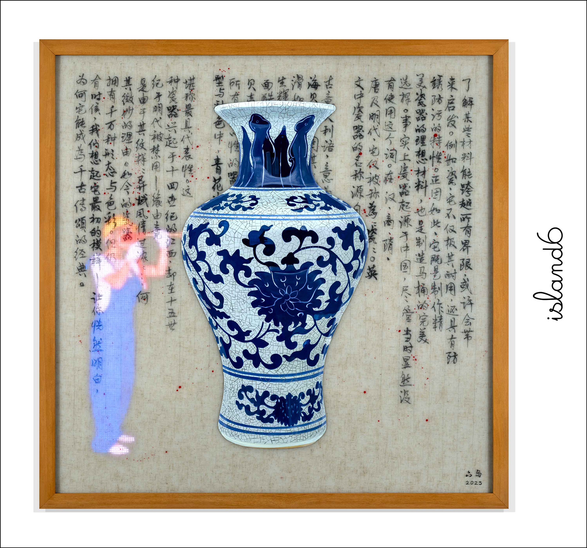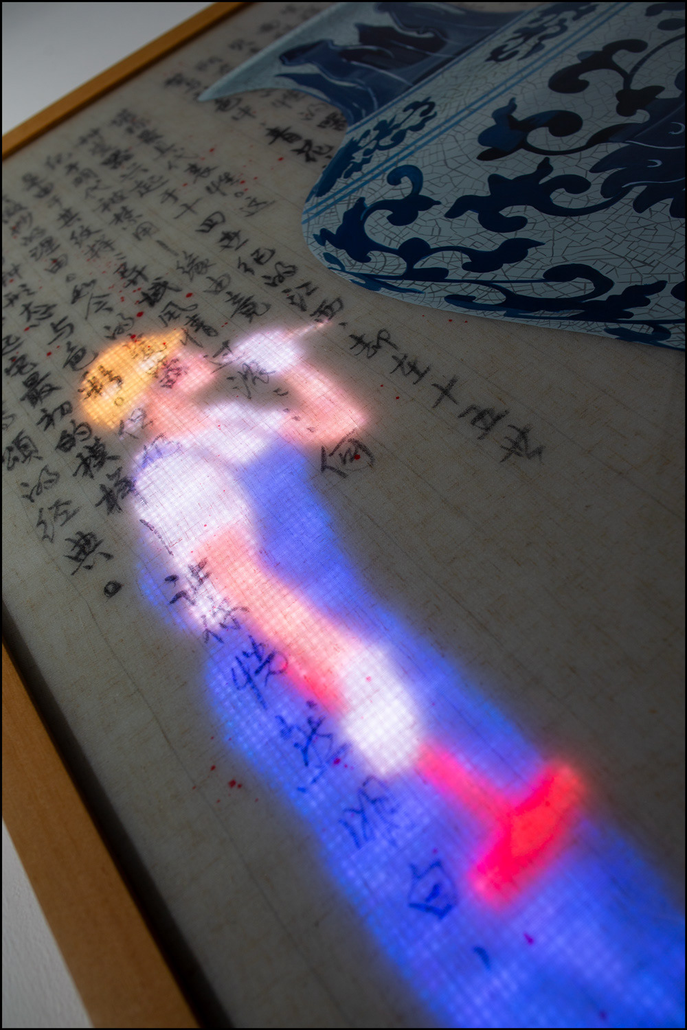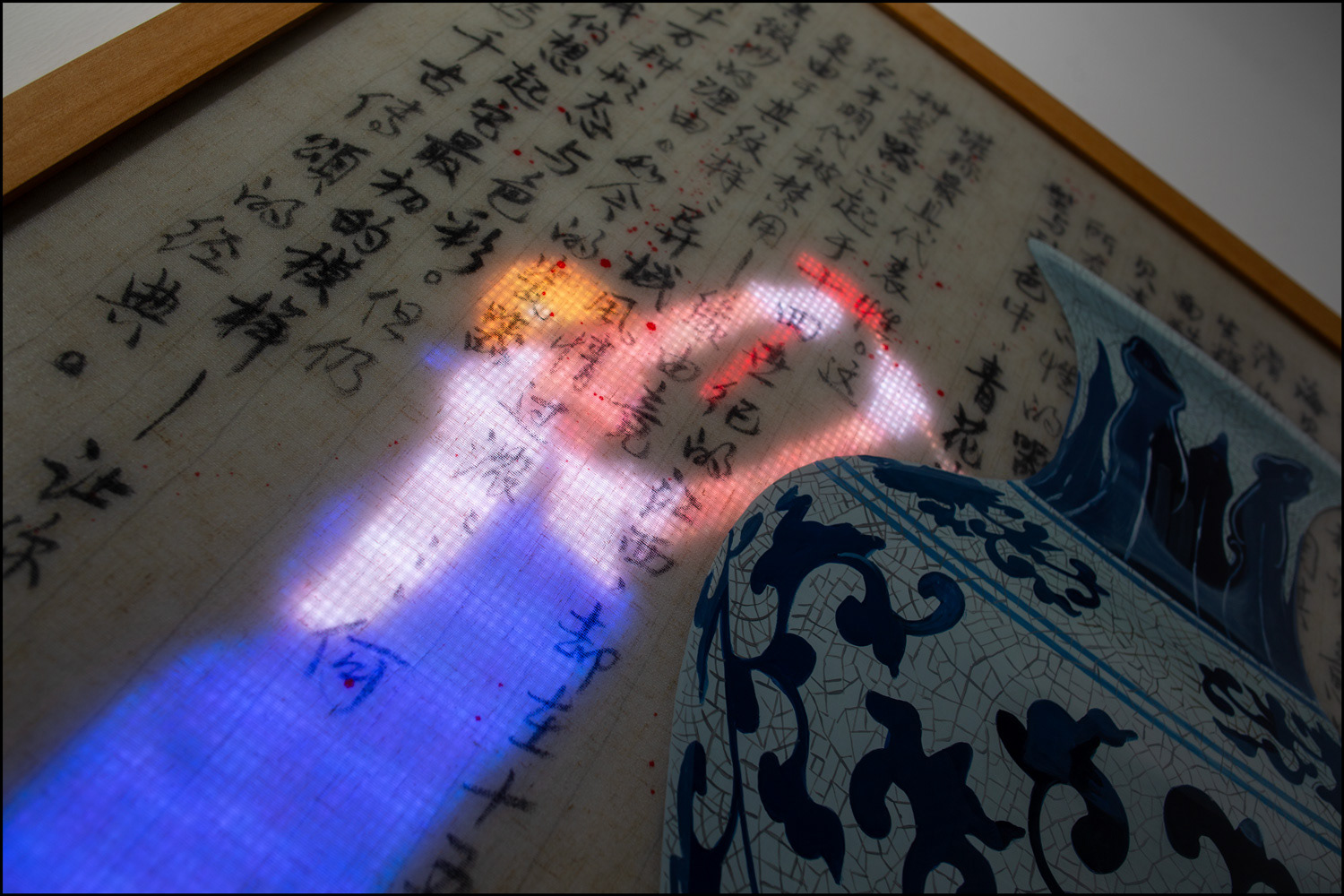 RGB LED display, oil painting on Plexiglass, Chinese ink on Vietnamese linen embedded in hand cast resin, teakwood frame