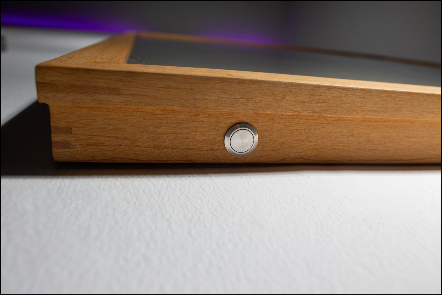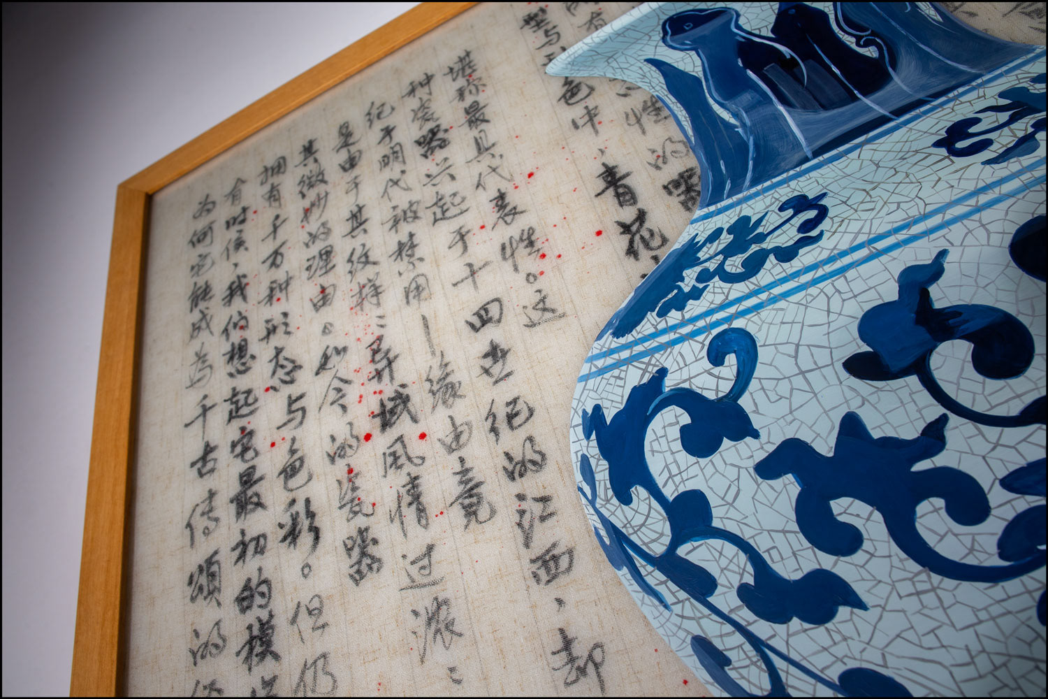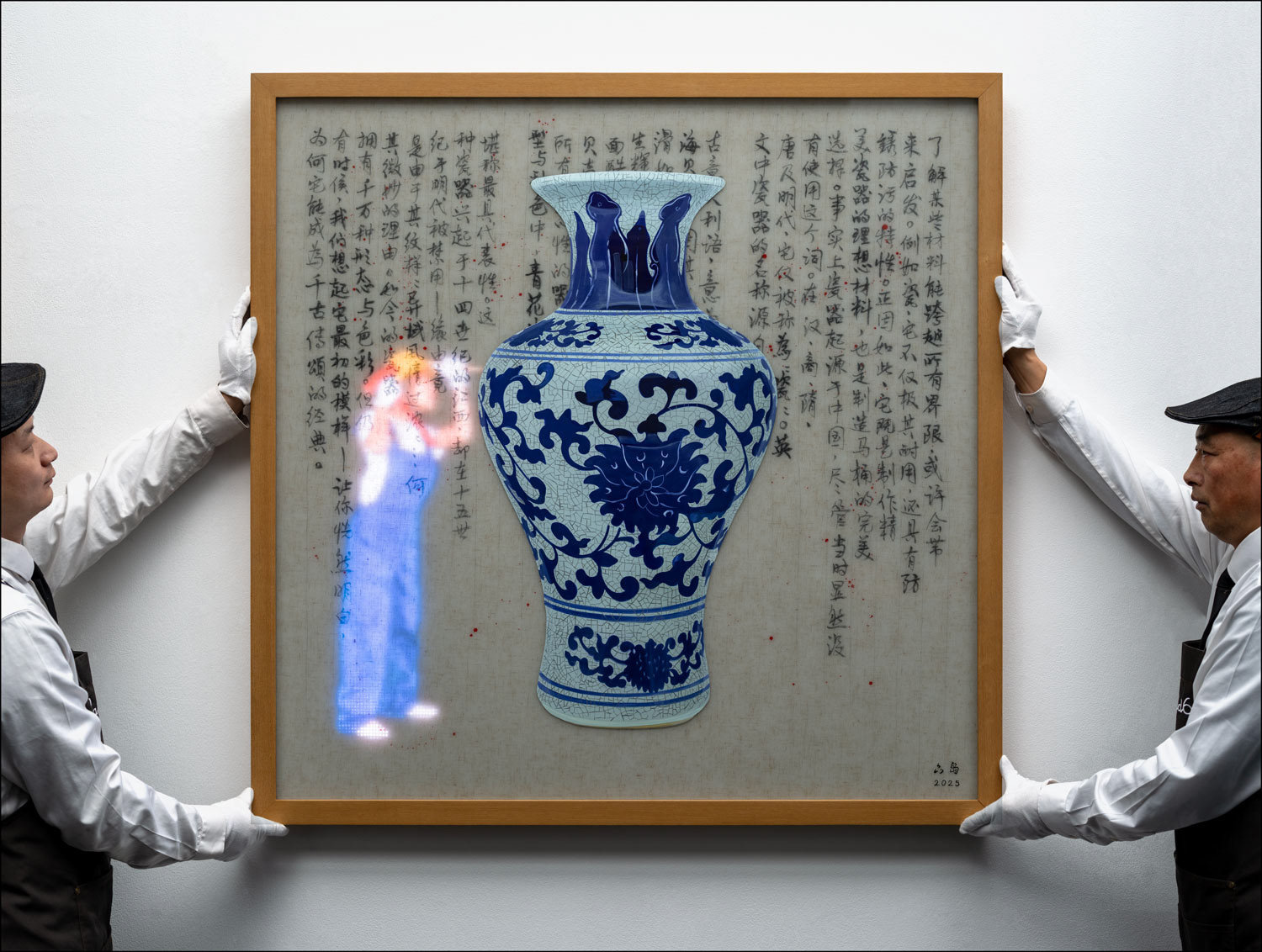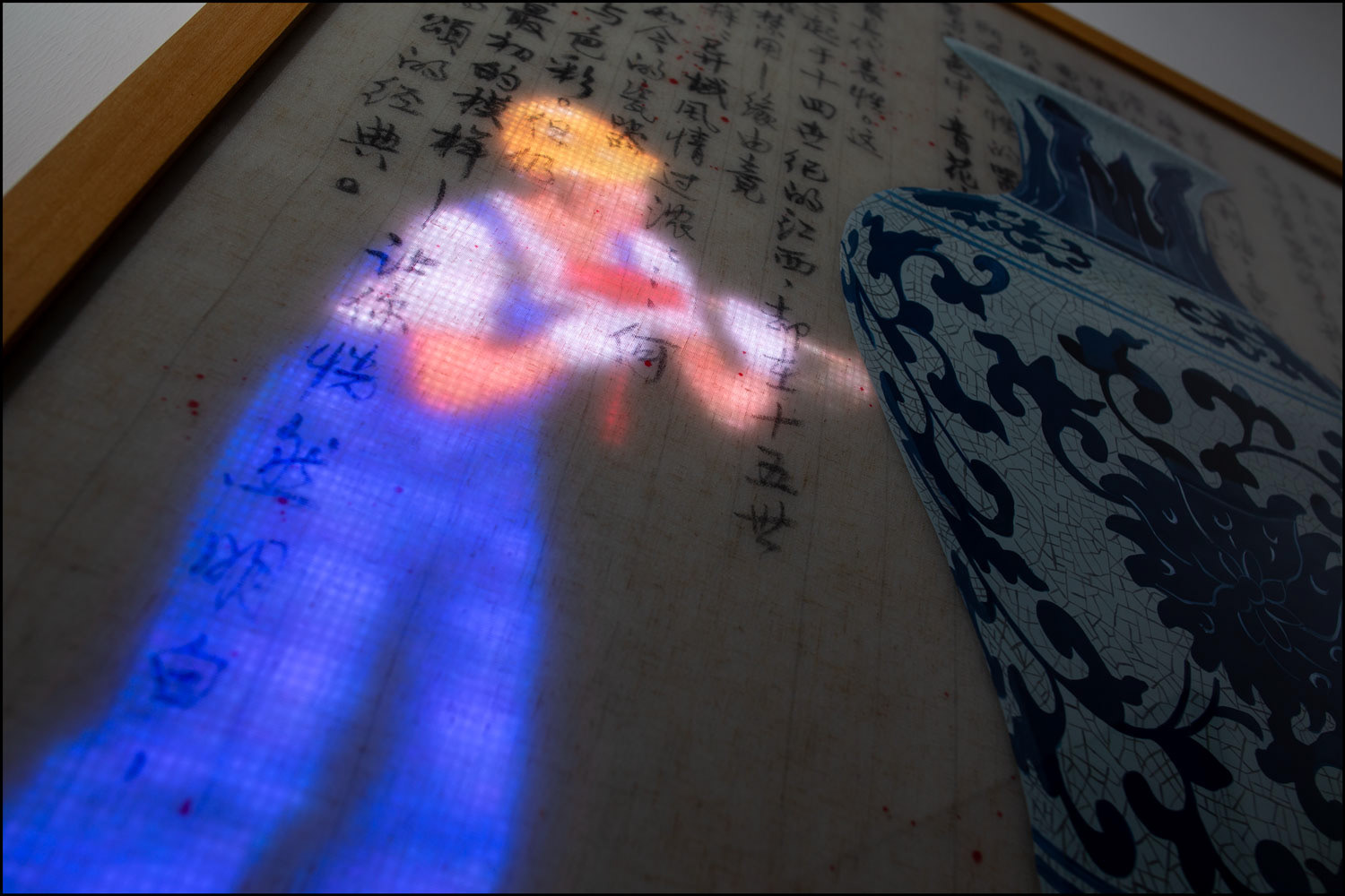RGB LED display, oil painting on Plexiglass, Chinese ink on Vietnamese linen embedded in hand cast resin, teakwood frame