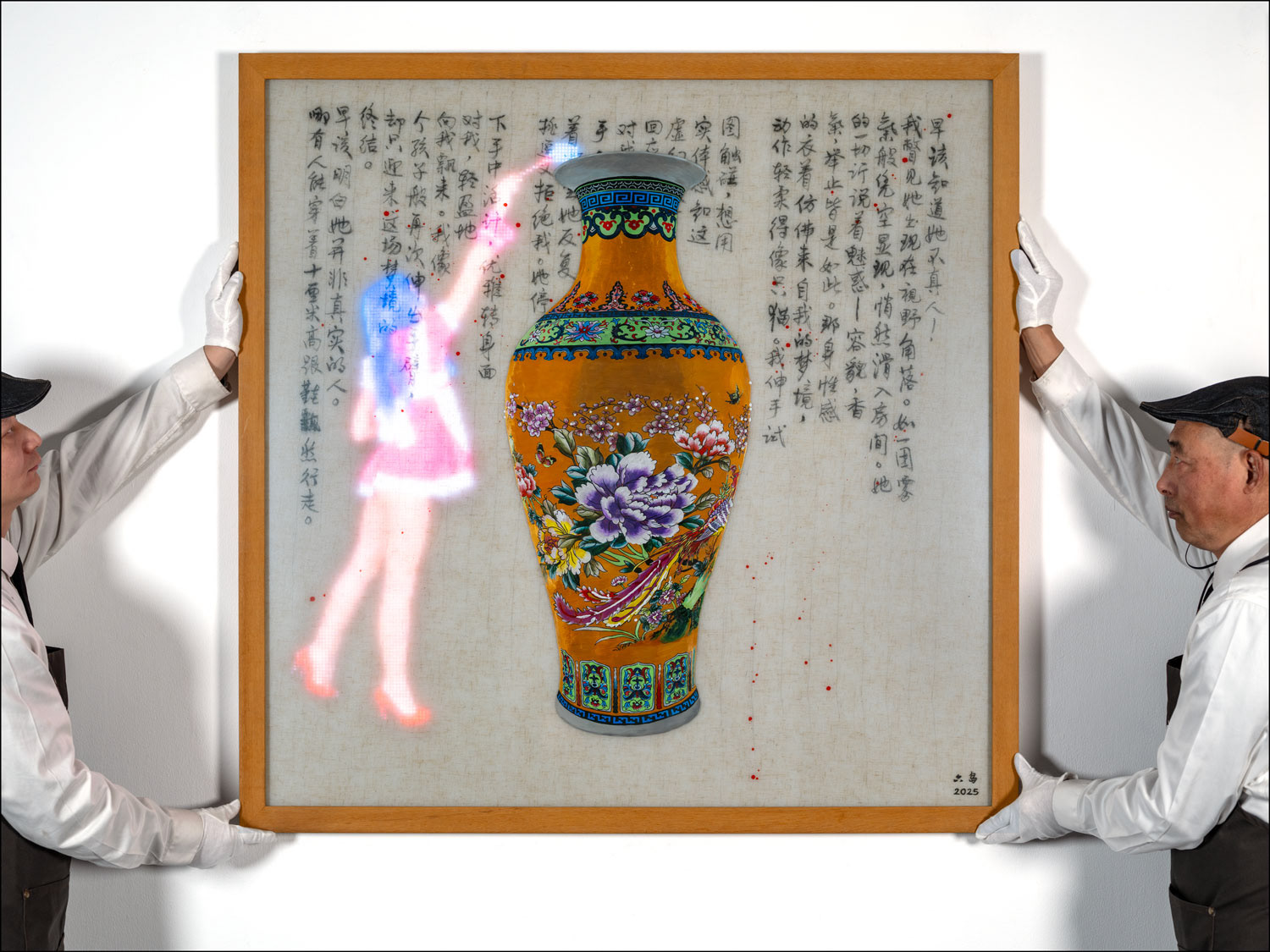 RGB LED display, oil painting on Plexiglass, Chinese ink on Vietnamese linen embedded in hand cast resin, teakwood frame