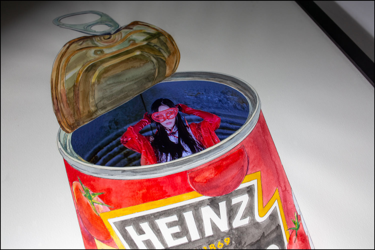TFT display, media player, Staedtler black pigment ink & Sennelier watercolor on Barbizon Canson paper, black-stained teakwood frame