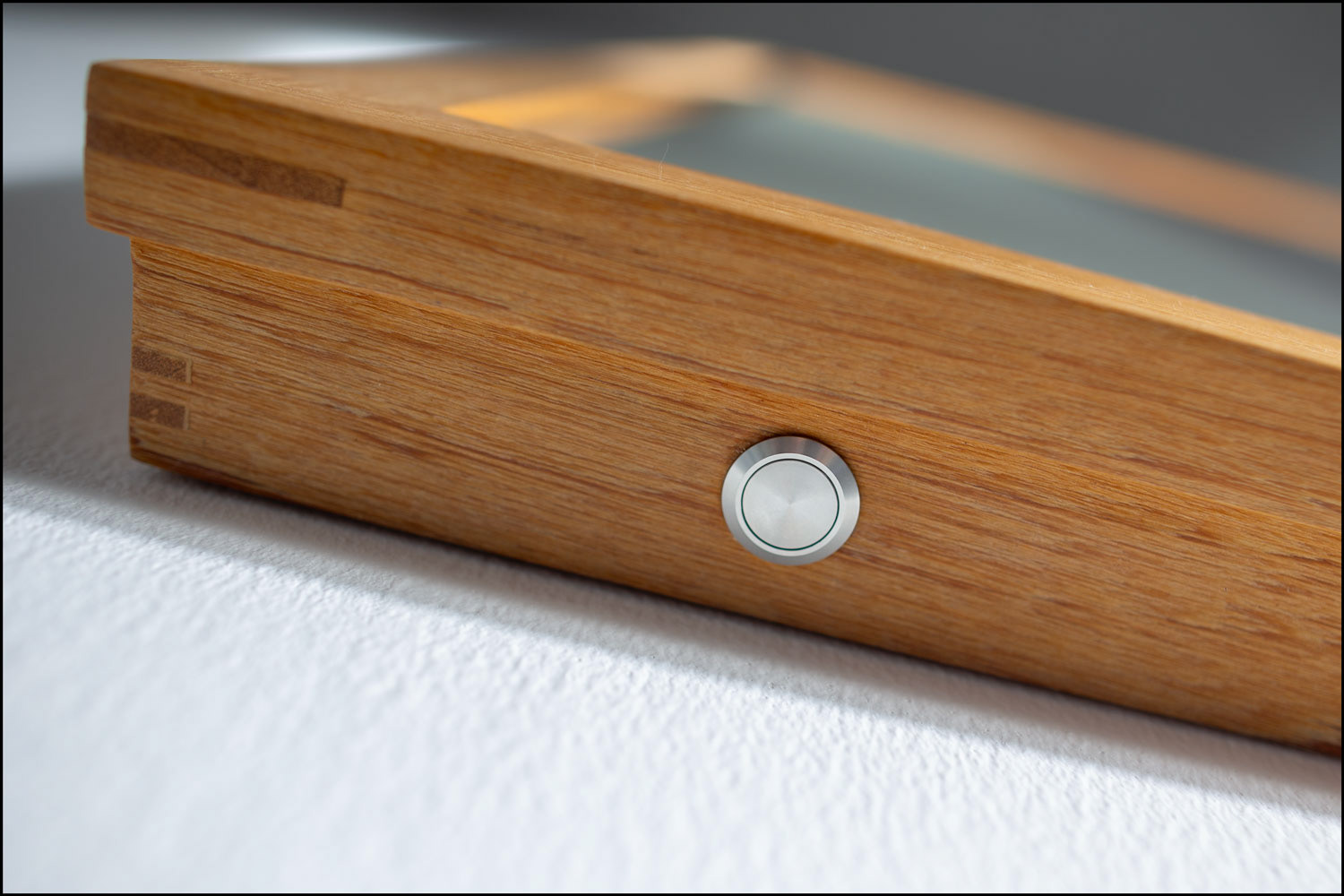 TFT display, media player, Staedtler black pigment ink, acrylic & oil paint on Vietnamese linen embedded in hand cast resin, teakwood frame