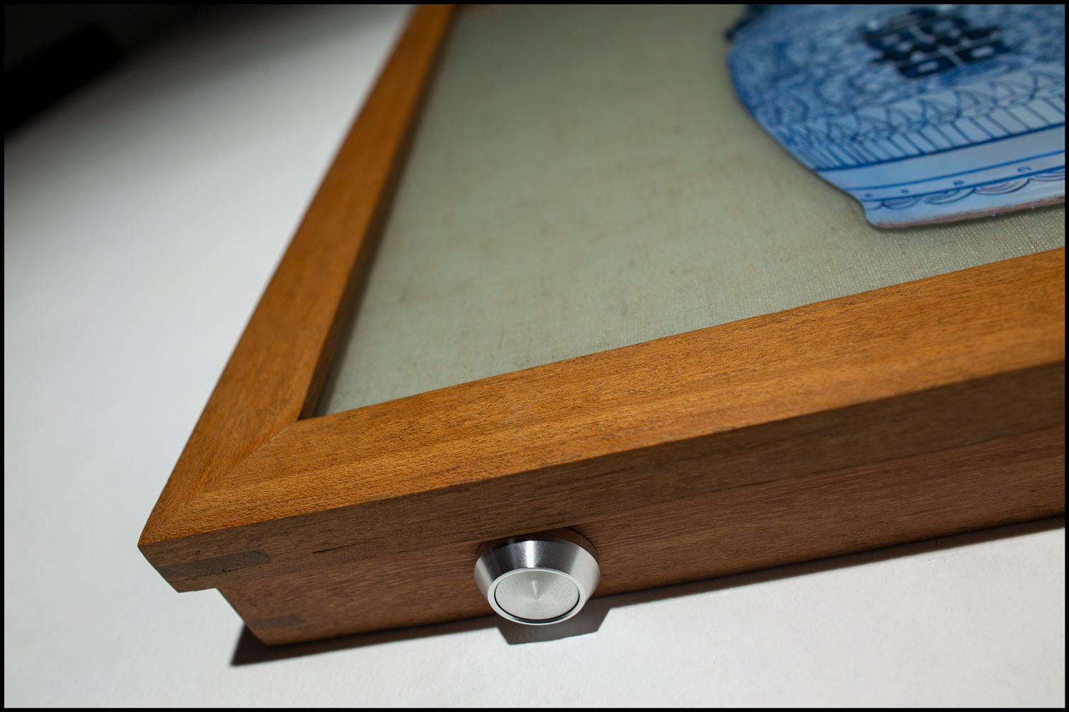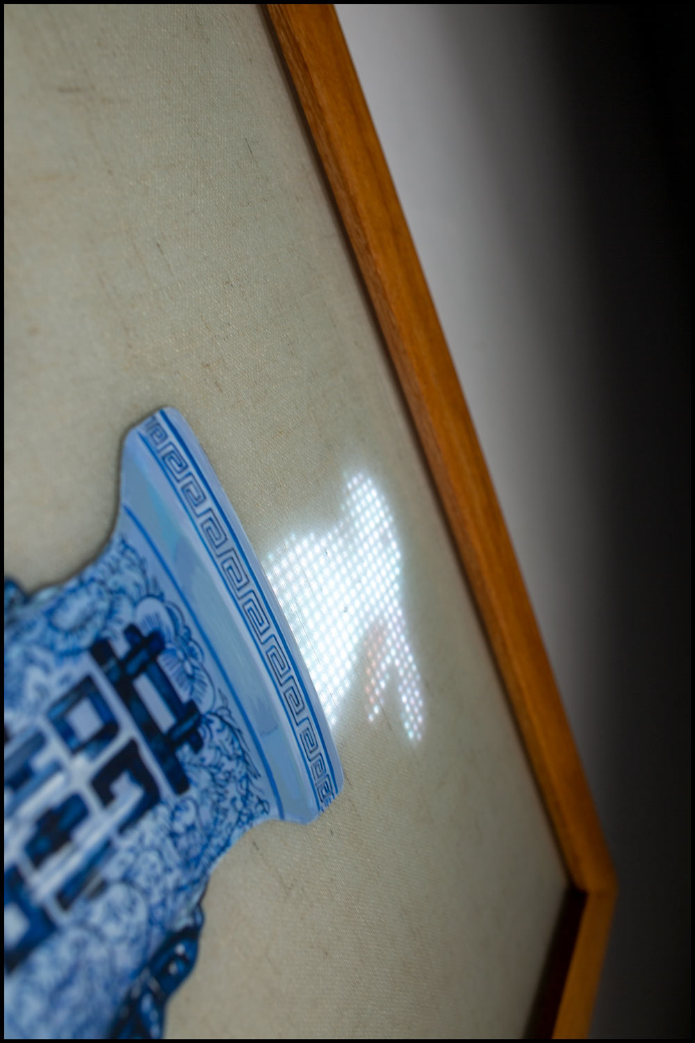 RGB LED display, acrylic painting on Plexiglass, Vietnamese linen embedded in hand cast resin, teakwood frame