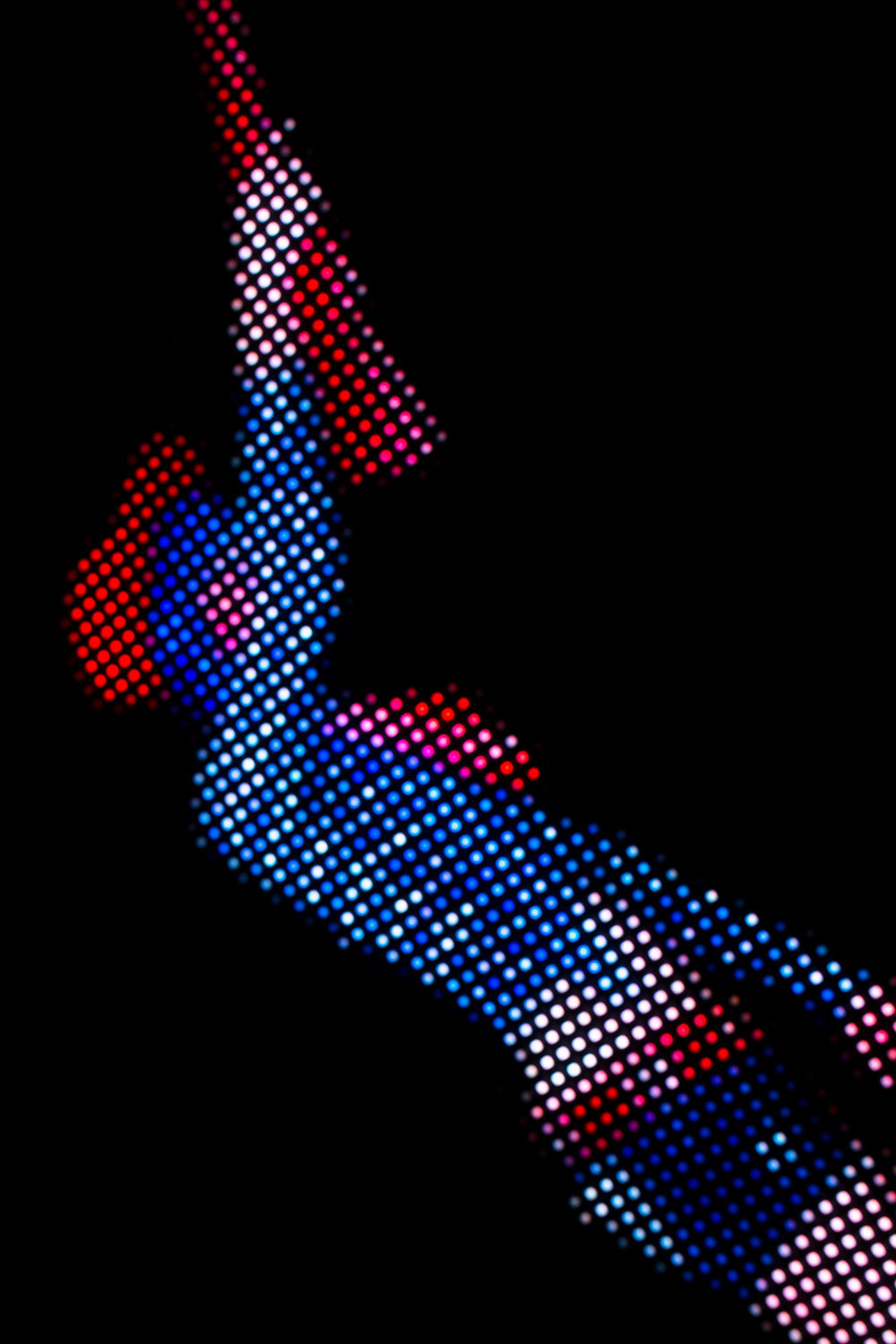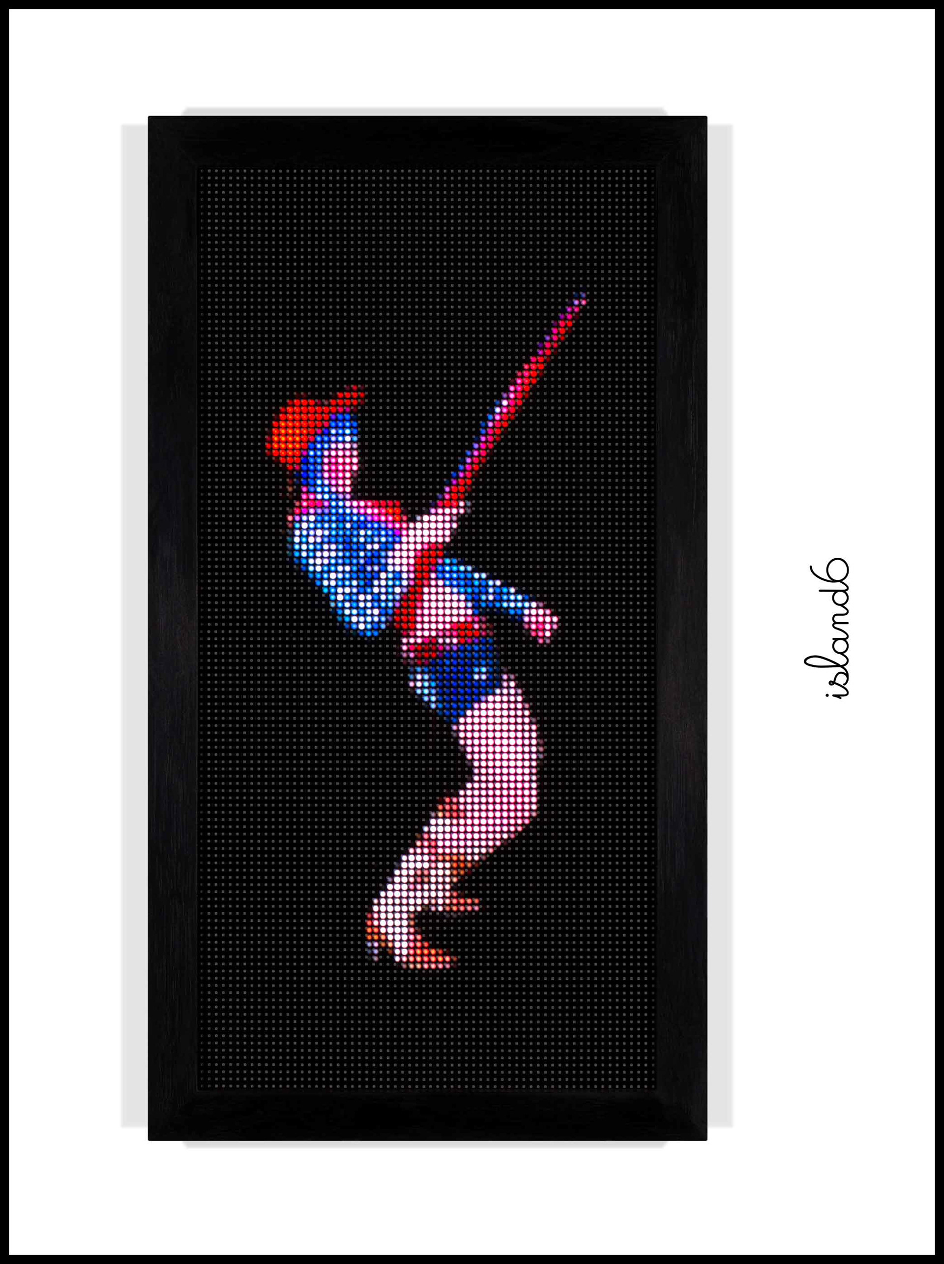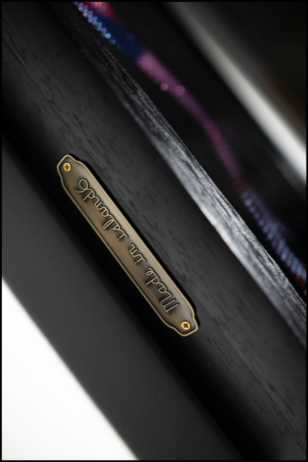 RGB LED display, polarized tempered glass, black-stained teakwood frame