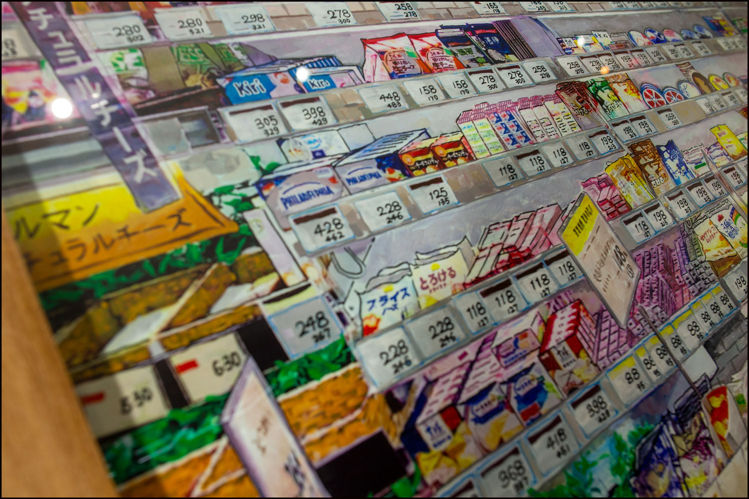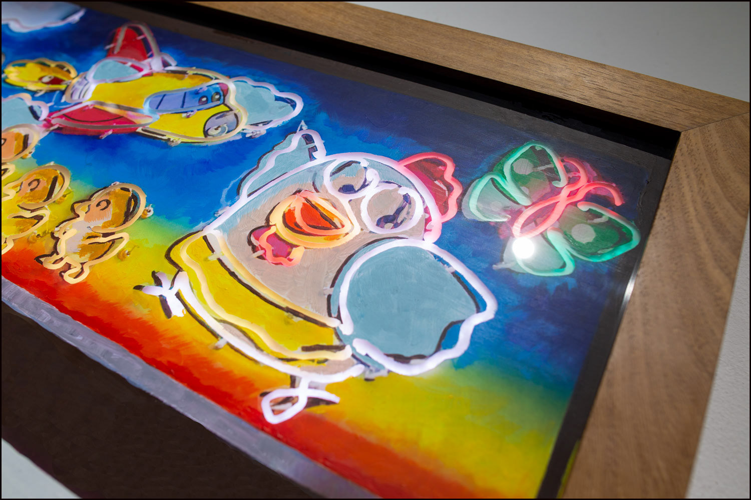 RGB LED display, acrylic painting on Plexiglass, teak wood frame
