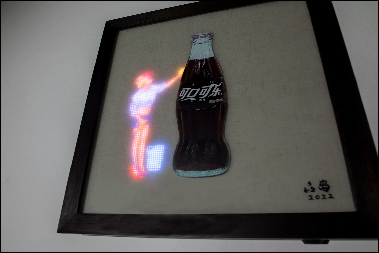 RGB LED display, acrylic painting on Plexiglass, Vietnamese linen embedded in hand cast resin, black-stained teakwood frame