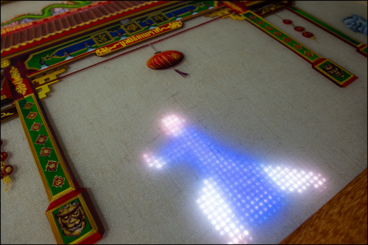 RGB LED display, acrylic painting on Plexiglass, Vietnamese linen embedded in hand cast resin, teakwood frame