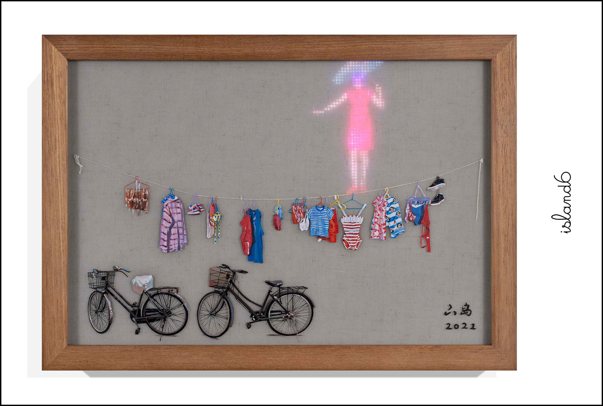 RGB LED display, acrylic painting on Plexiglass, Vietnamese linen embedded in hand cast resin, black-stained teakwood frame