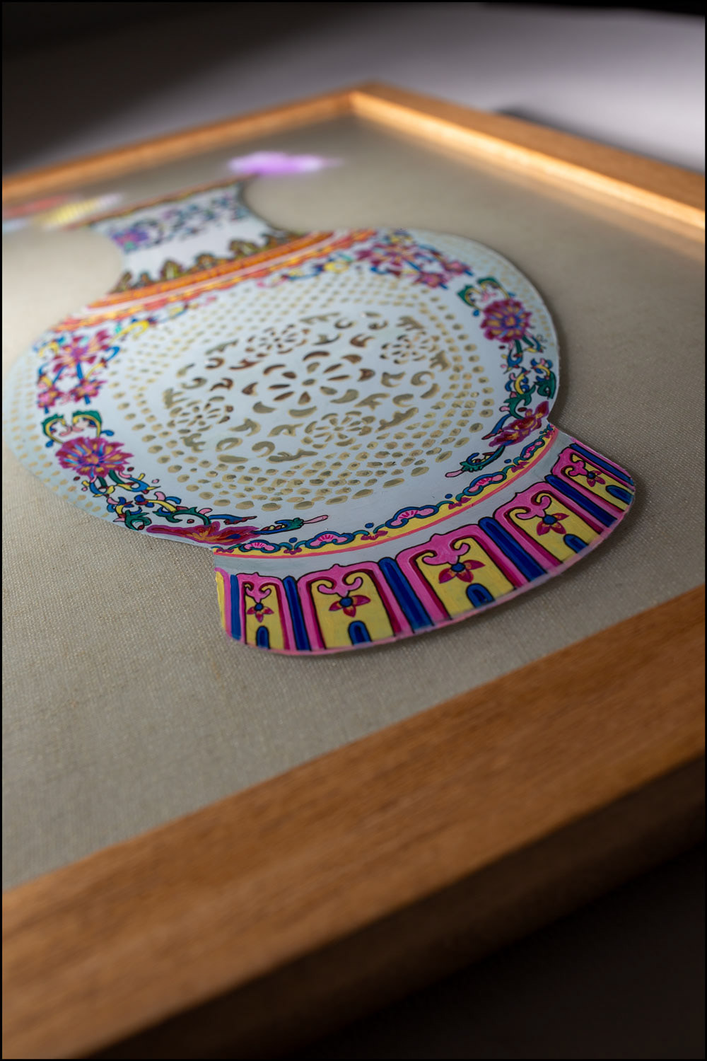 RGB LED display, acrylic painting on Plexiglass, Vietnamese linen embedded in hand cast resin, teakwood frame