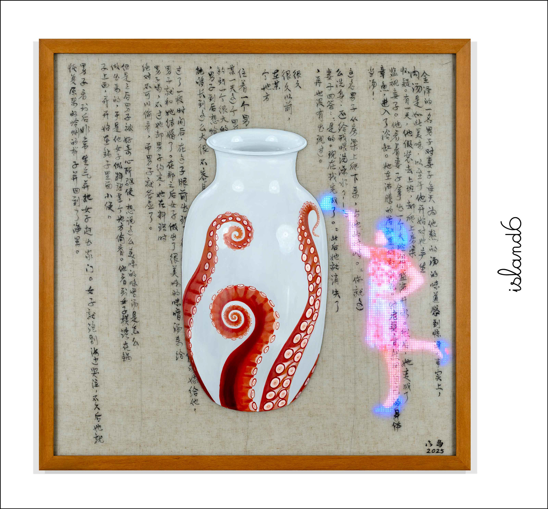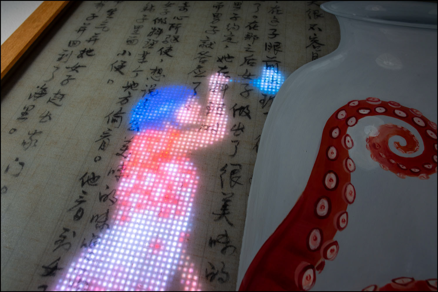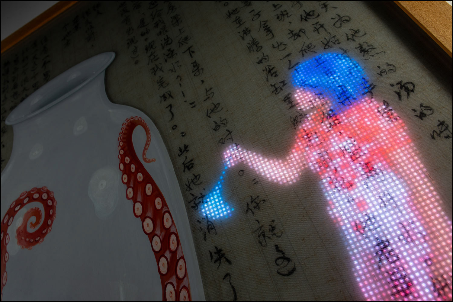 RGB LED display, acrylic painting on Plexiglass, Chinese ink on Vietnamese linen embedded in hand cast resin, teakwood frame