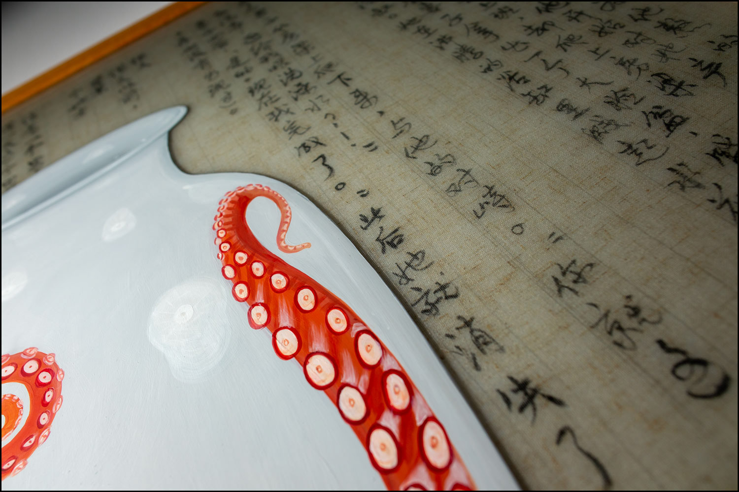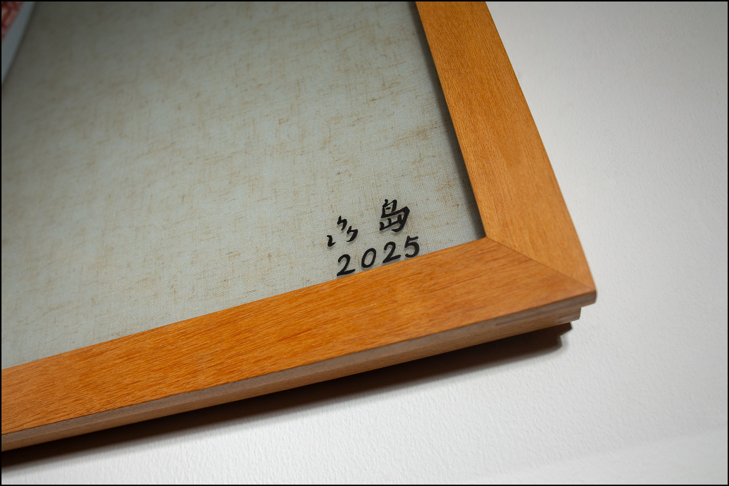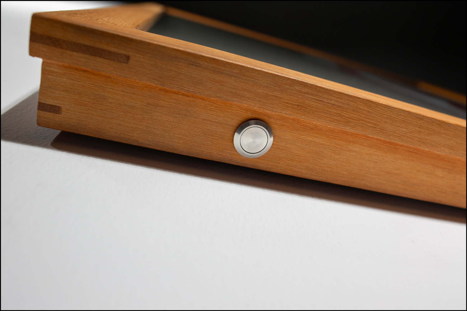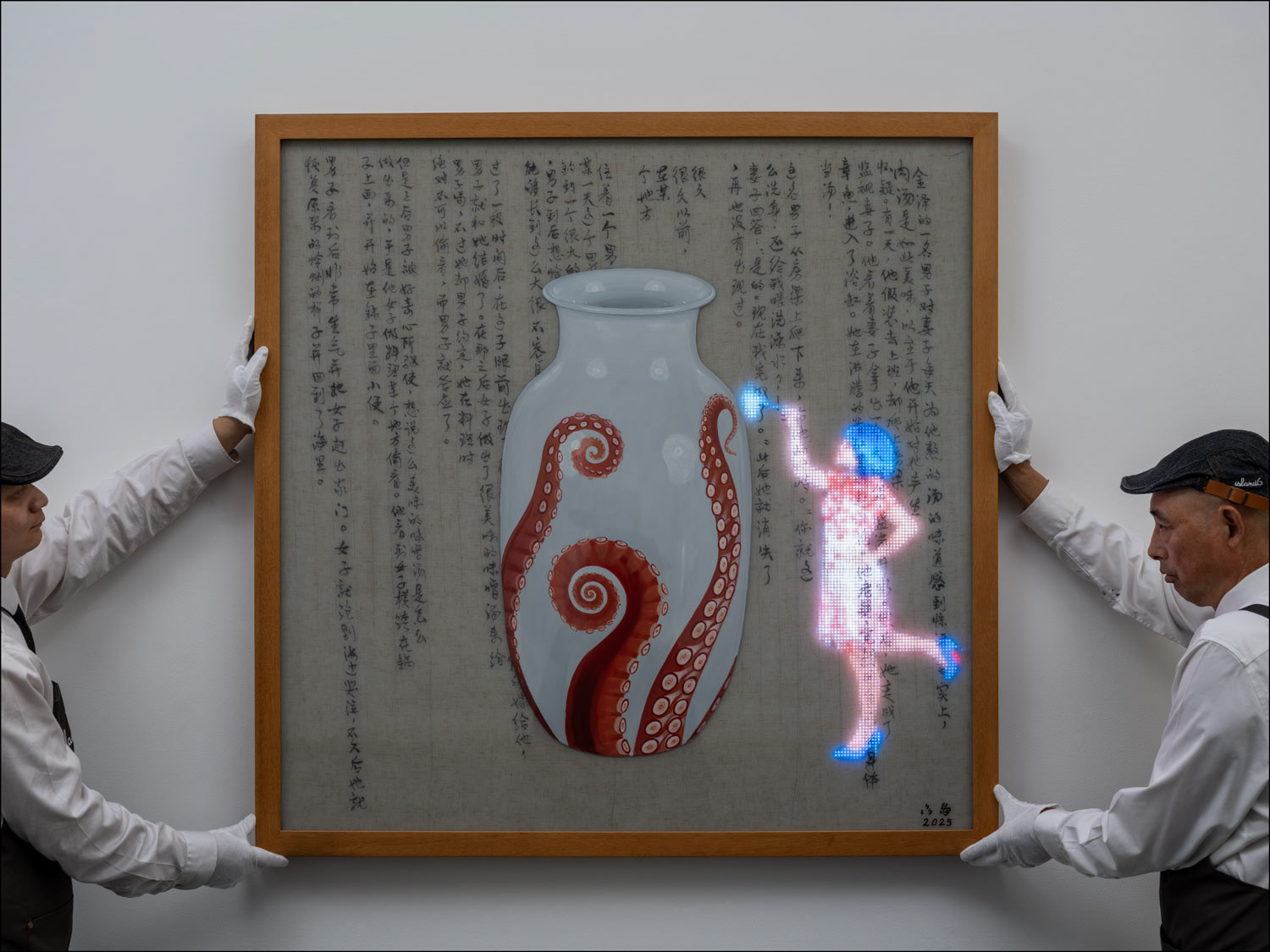 RGB LED display, acrylic painting on Plexiglass, Chinese ink on Vietnamese linen embedded in hand cast resin, teakwood frame