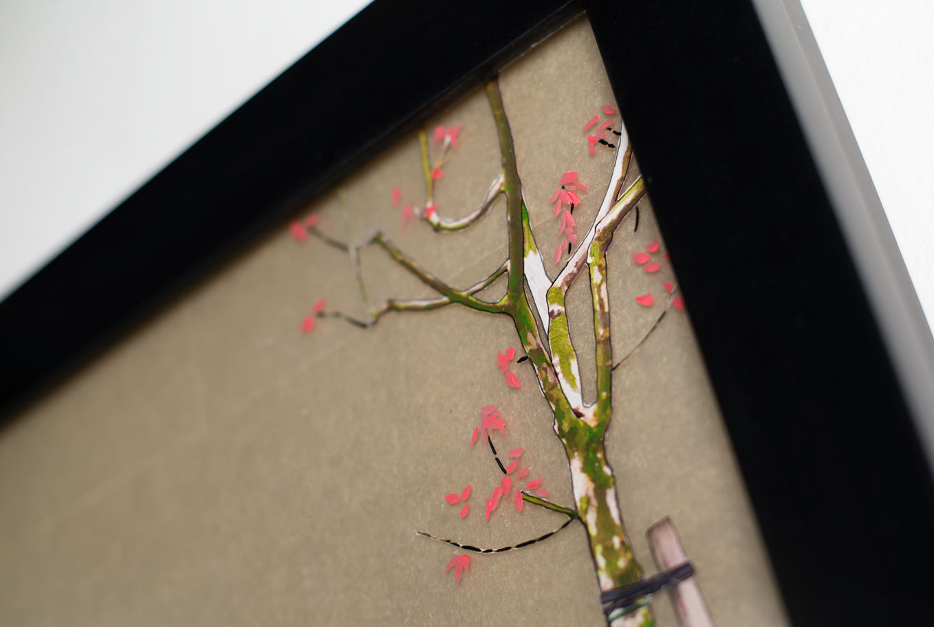 RGB LED display, acrylic painting on Plexiglas, paper collage, Corian & teakwood frame