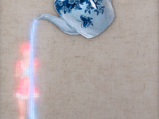 RGB LED display, TFT display, CCD camera, acrylic painting on Plexiglass, media player, teakwood frame