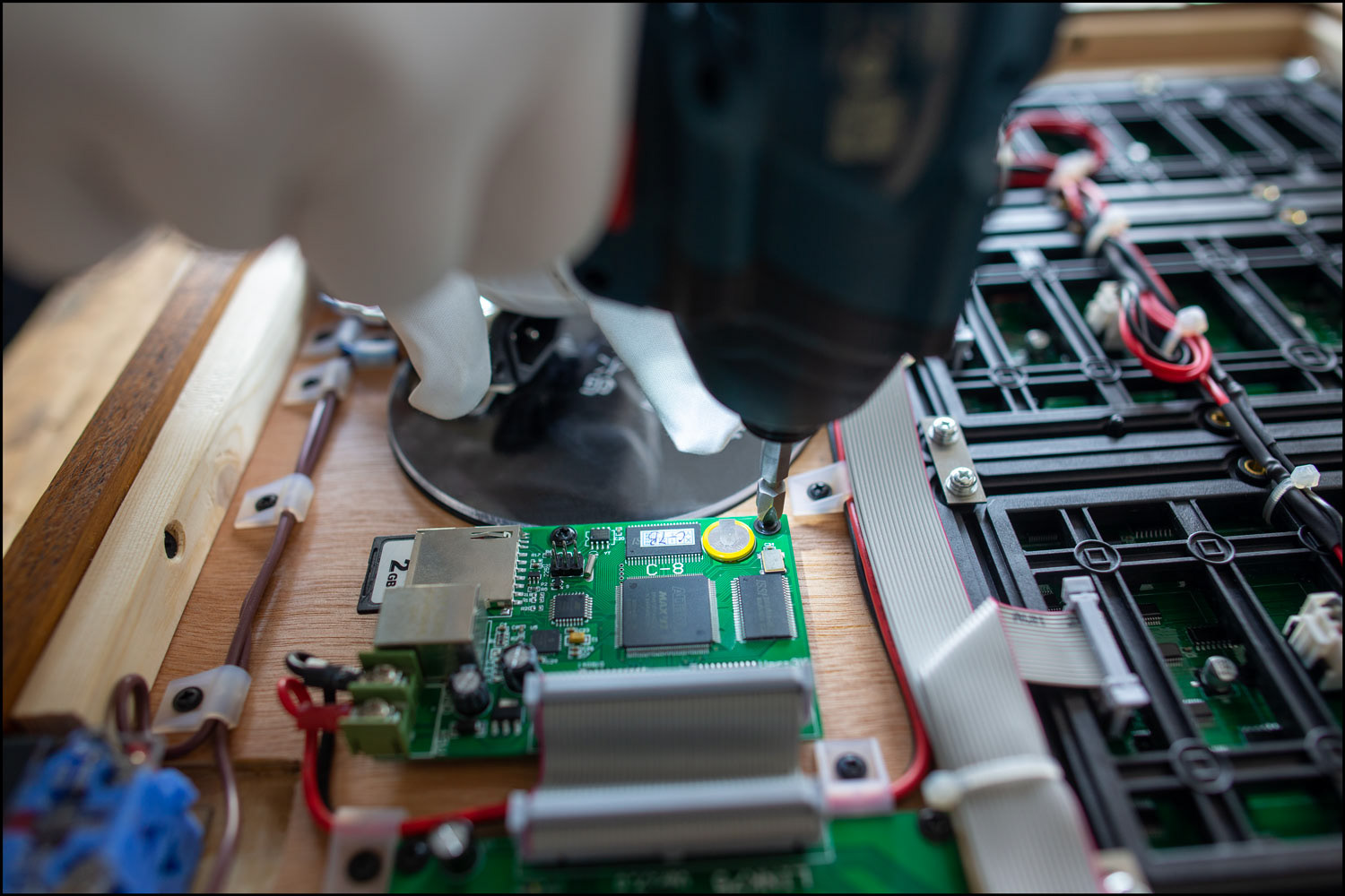 RGB LED display, acrylic painting on Plexiglass, Vietnamese linen embedded in hand cast resin, teakwood frame