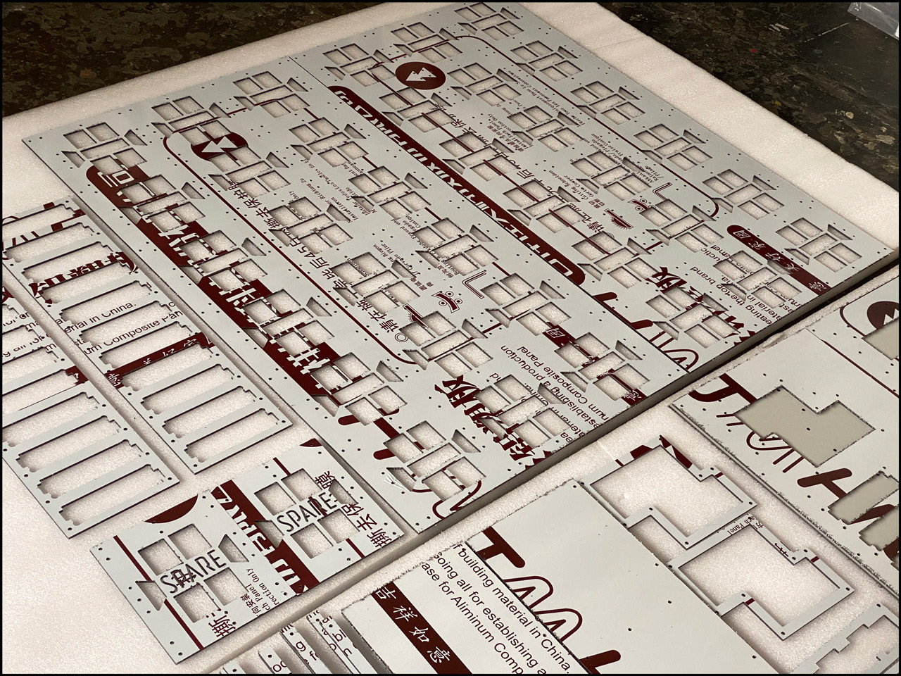 Layout of the various Dibond parts (aluminum composite) to be laser cut (Dibond #666666 4mm):