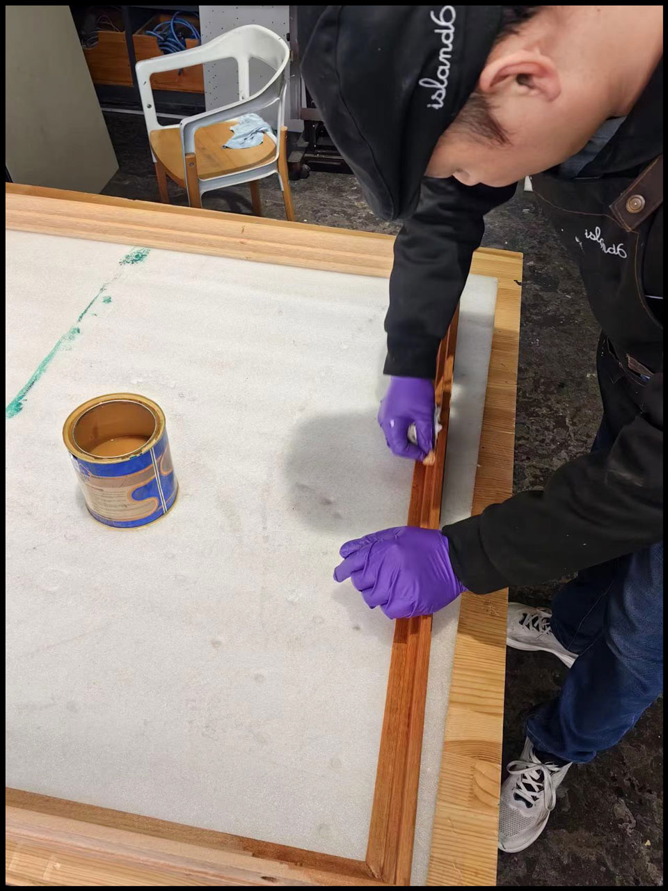 Sanding and waxing frames, installing recessed power switch