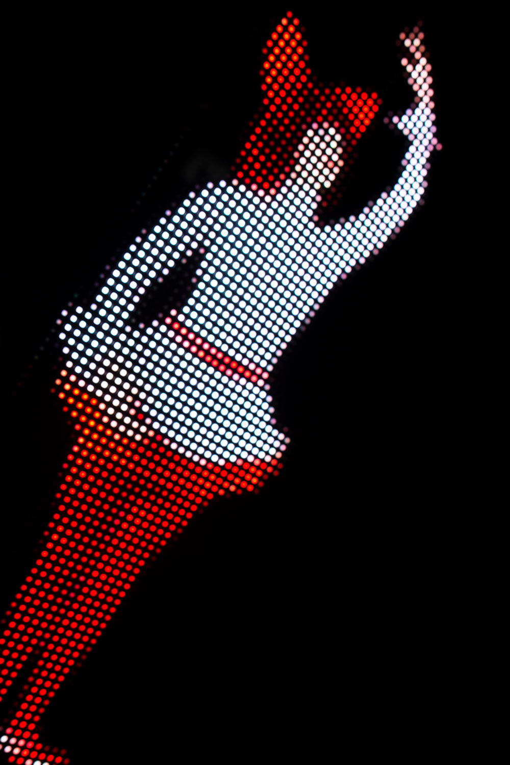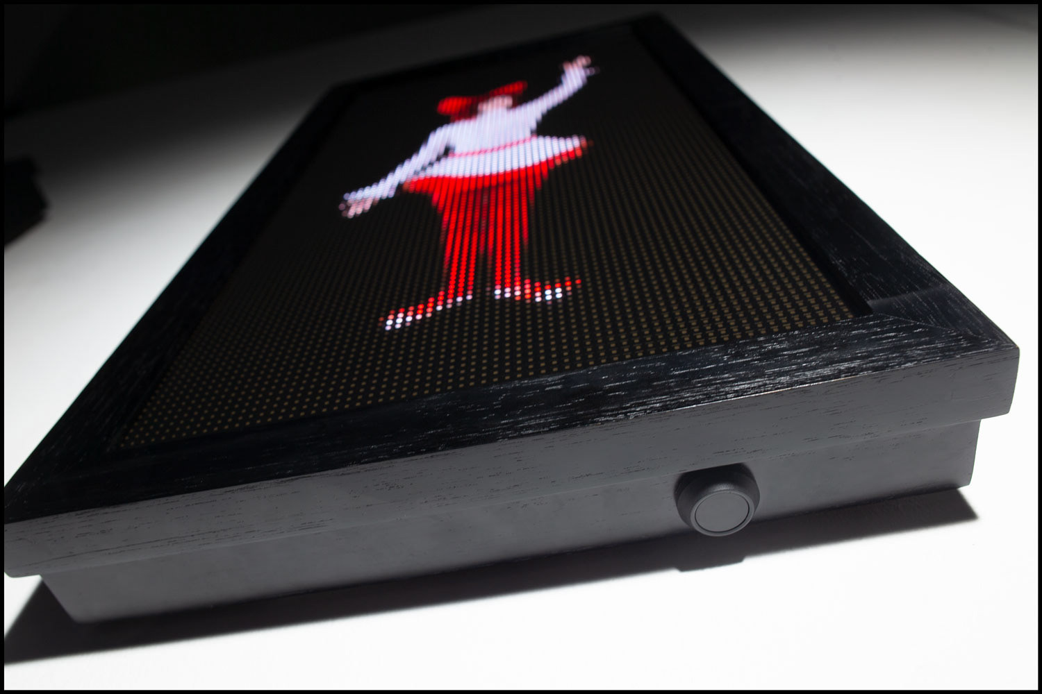 RGB LED display, polarized tempered glass, black-stained teakwood frame