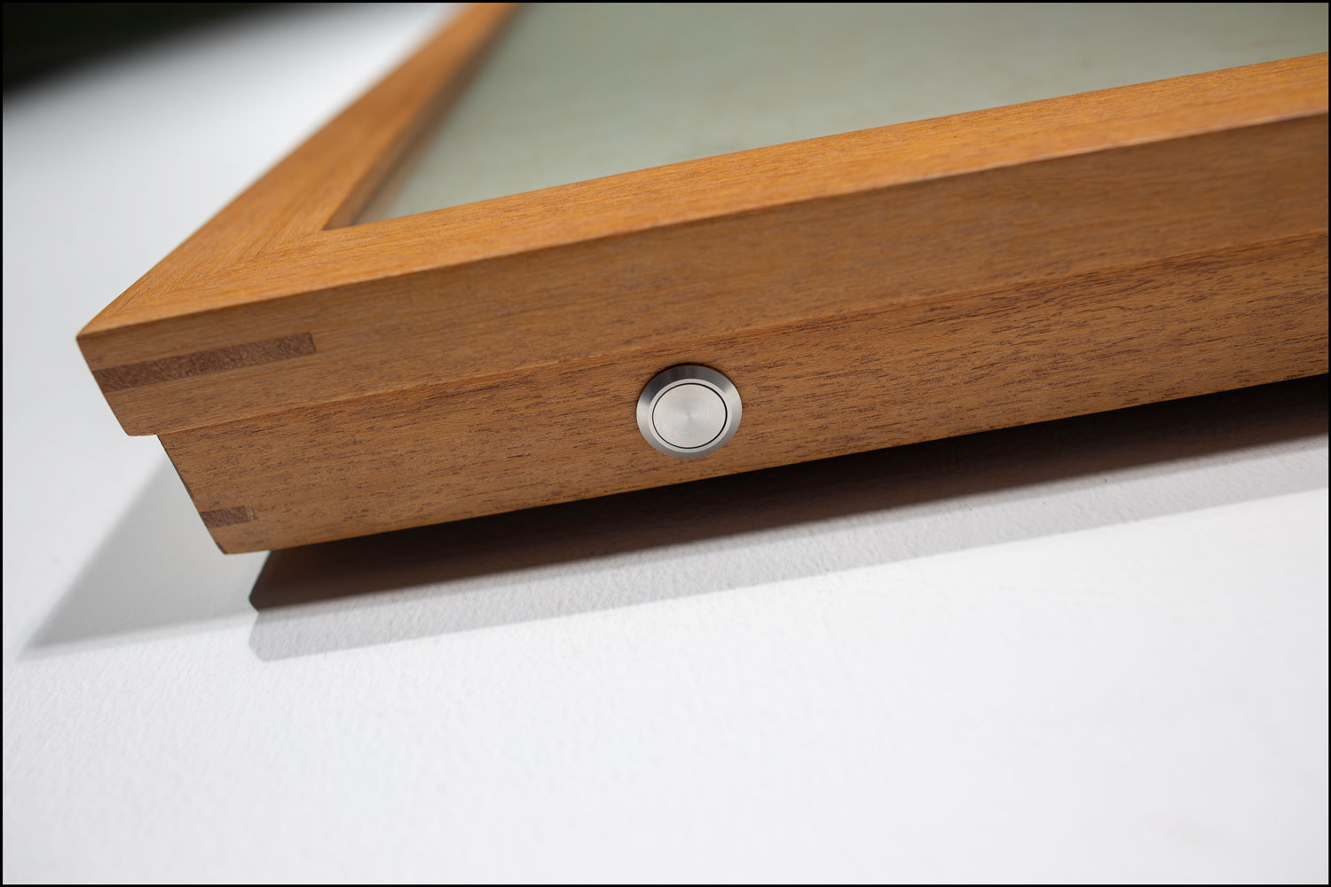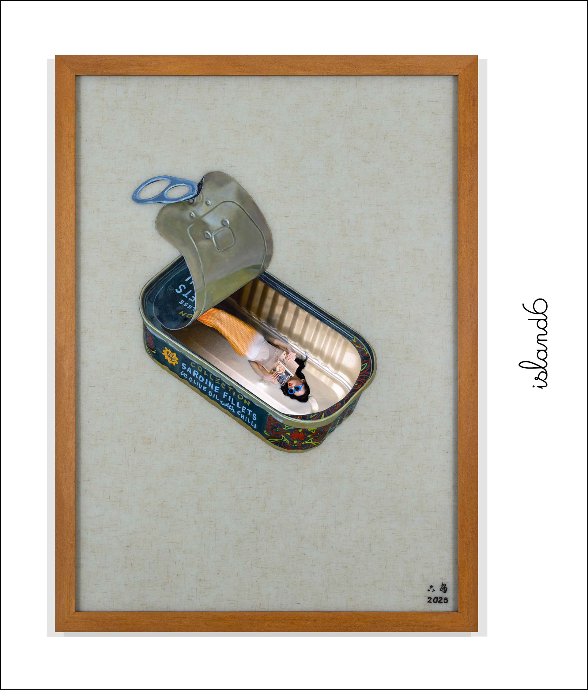 TFT display, media player, Staedtler black pigment ink & Pebeo oil paint on Vietnamese linen embedded in hand cast resin, teakwood frame