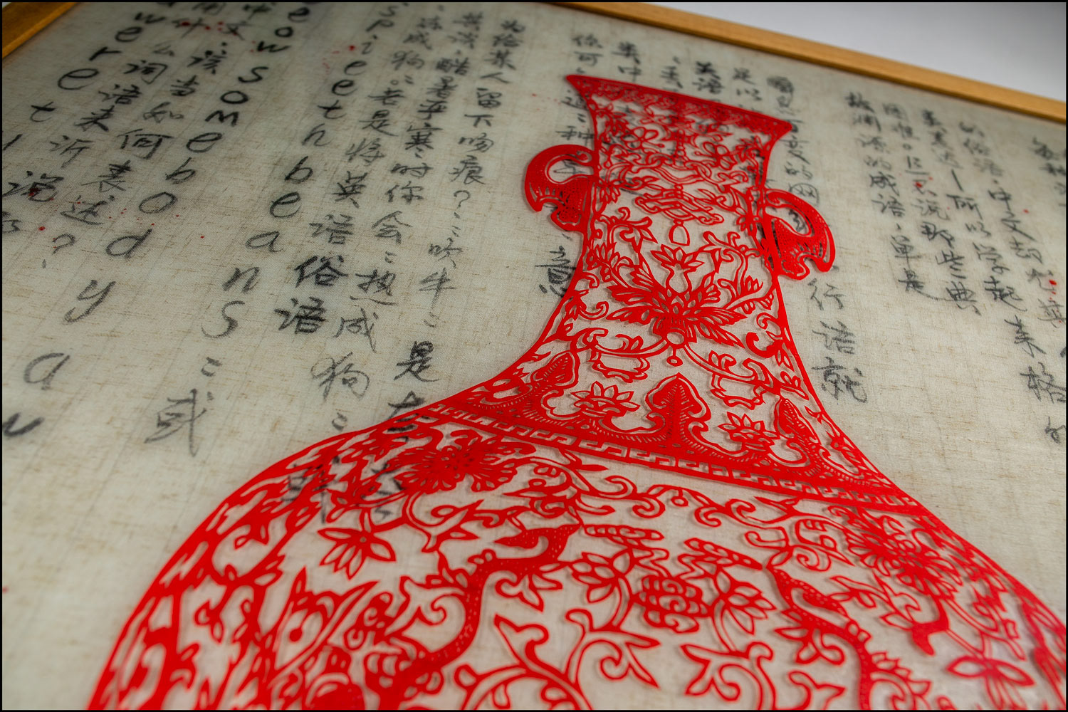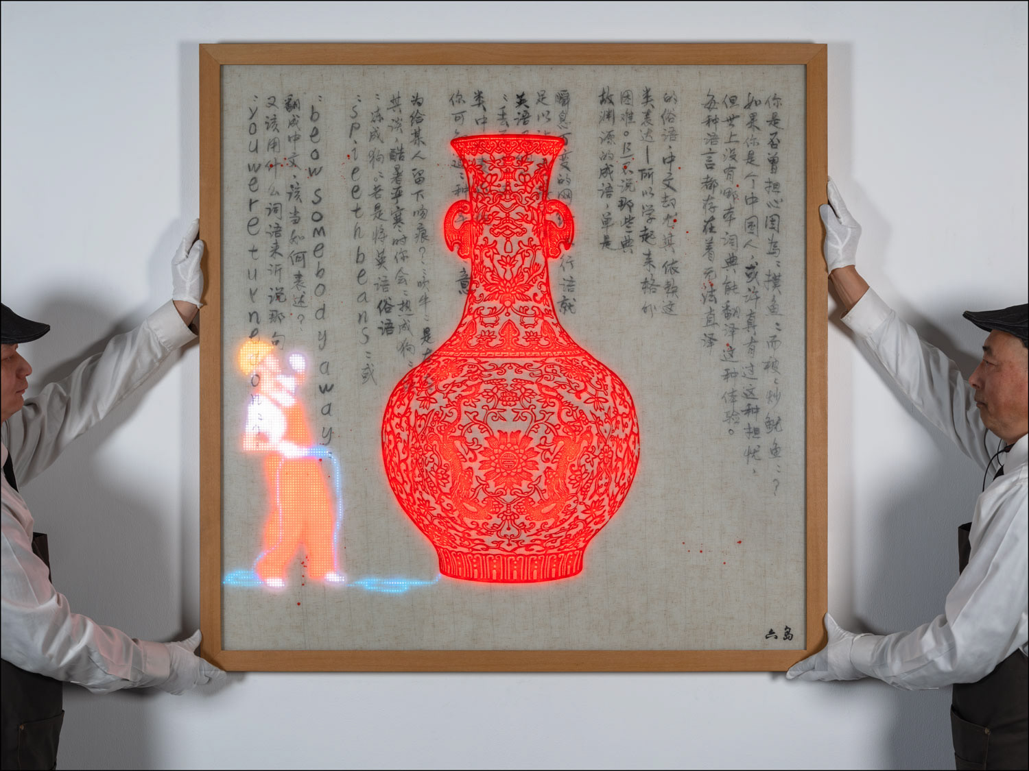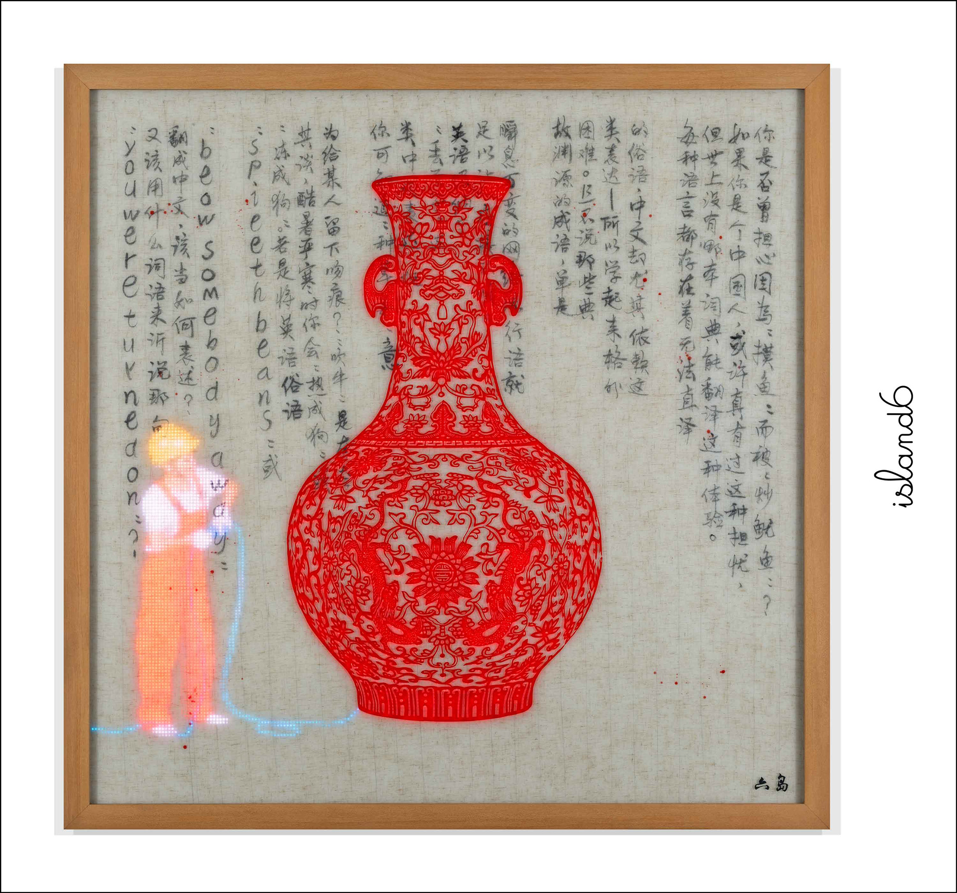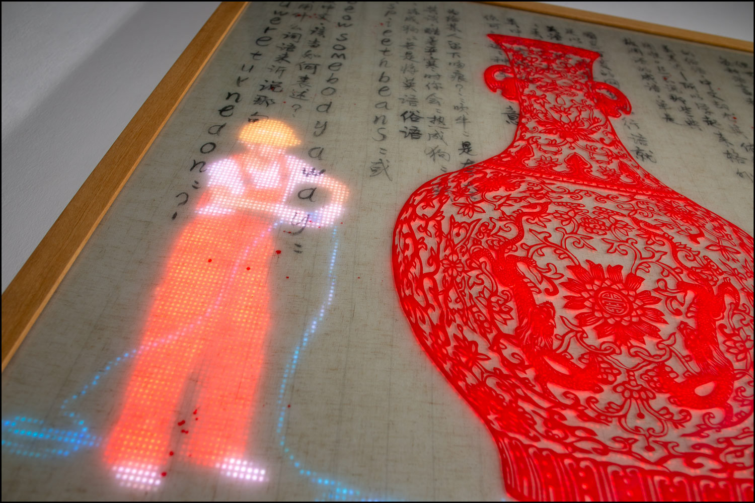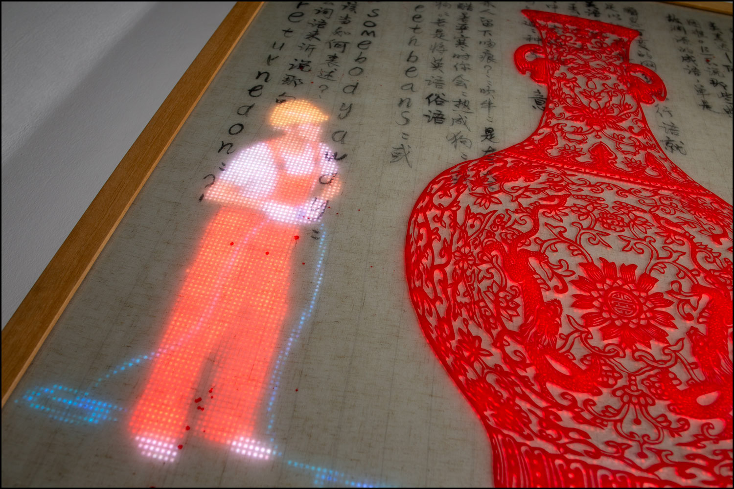 RGB LED display, Chinese papercut (Jian Zhi 剪紙) on Plexiglass, Chinese ink on Vietnamese linen embedded in hand cast resin, teakwood frame