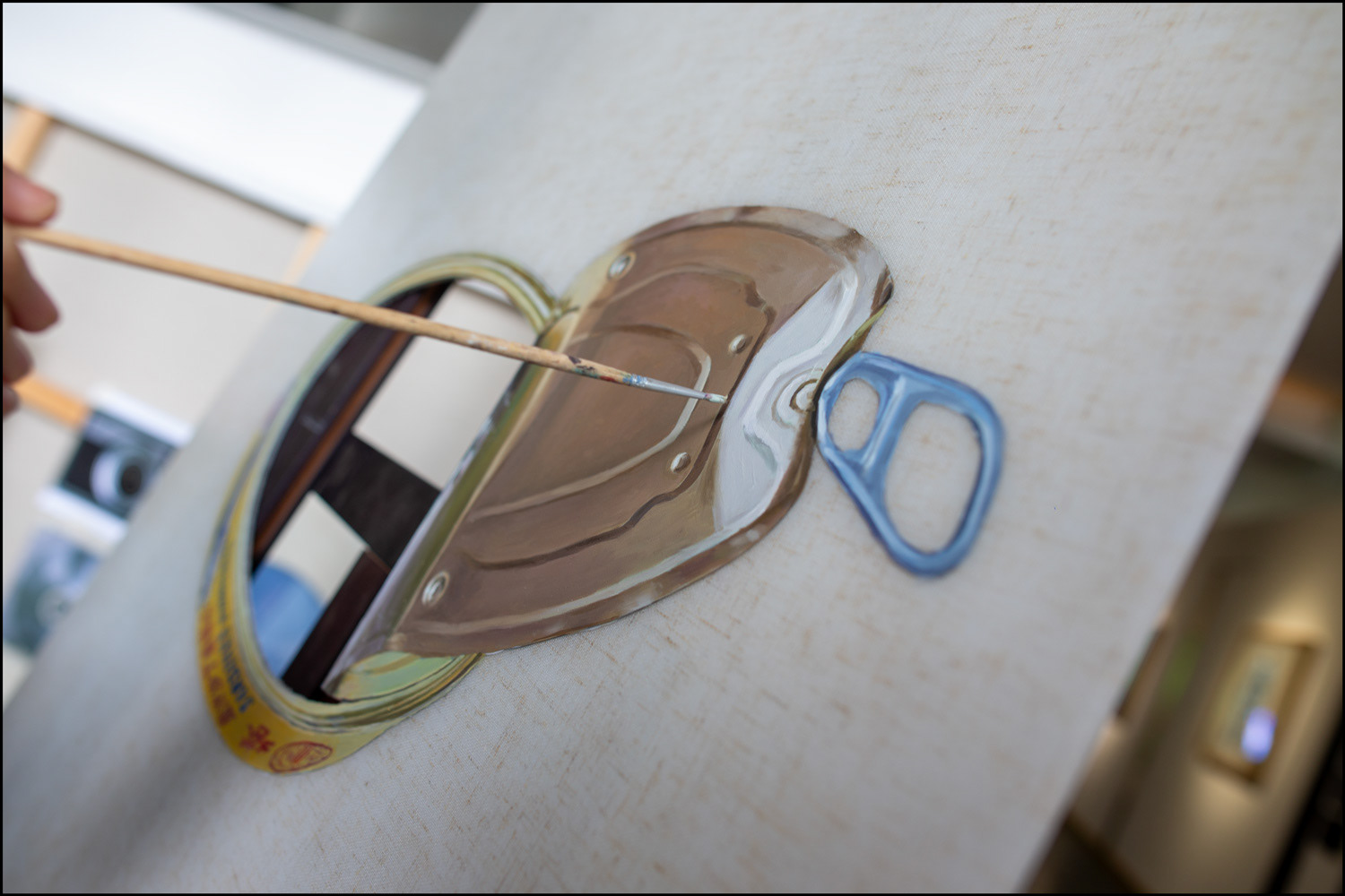 TFT display, media player, Staedtler black pigment ink, acrylic & oil paint on Vietnamese linen embedded in hand cast resin, teakwood frame