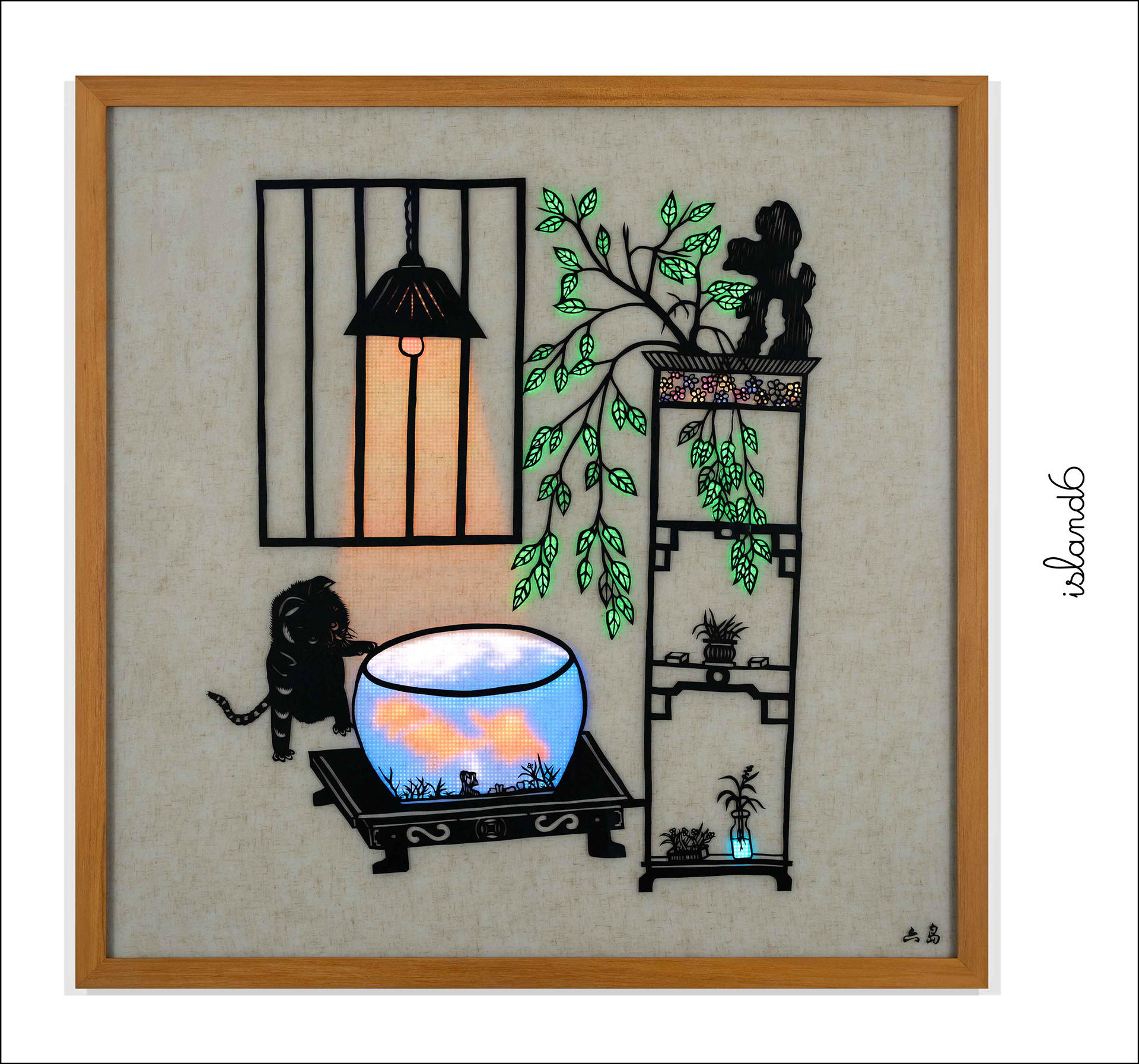 RGB LED display Chinese papercut (Jian Zhi 剪紙) on Plexiglass, Vietnamese linen embedded in hand cast resin, teakwood frame