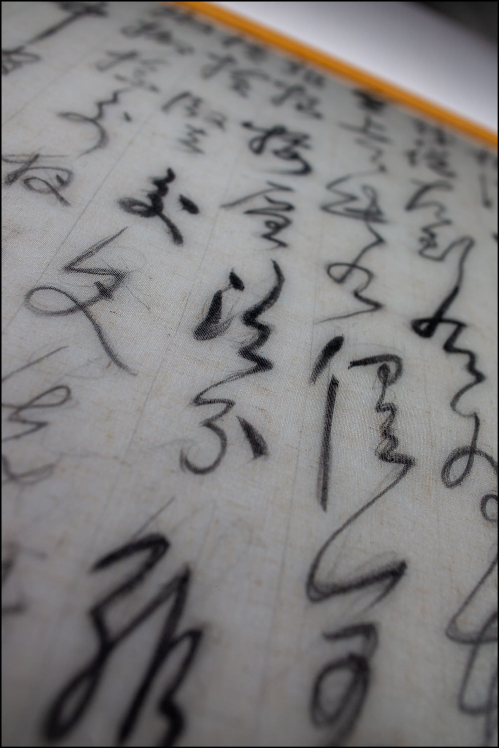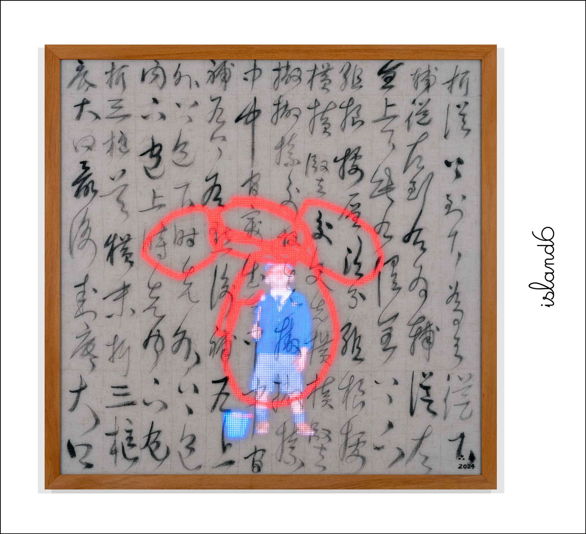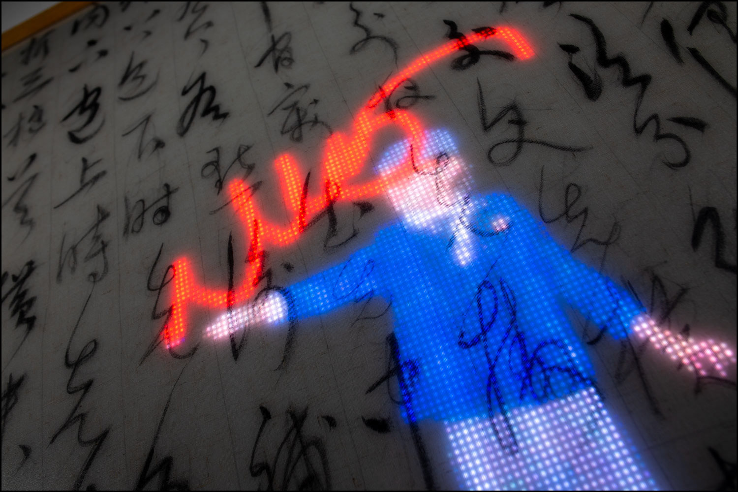 RGB LED display, Chinese ink on Vietnamese linen embedded in hand cast resin, teakwood frame
