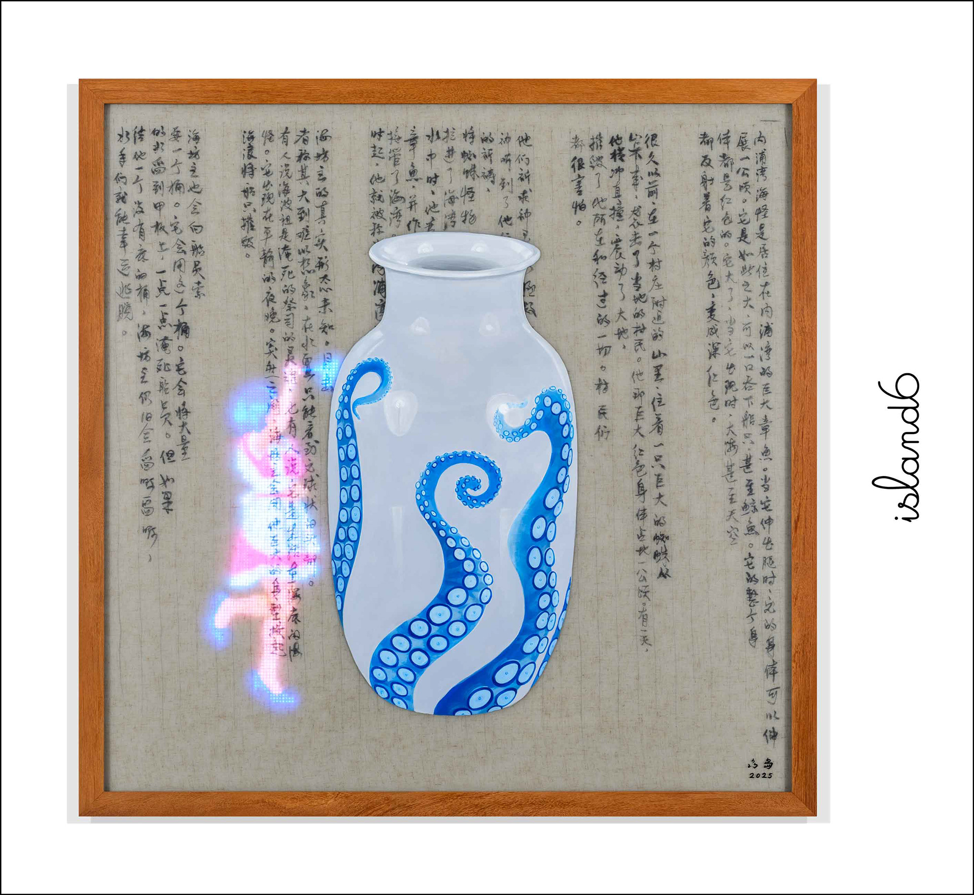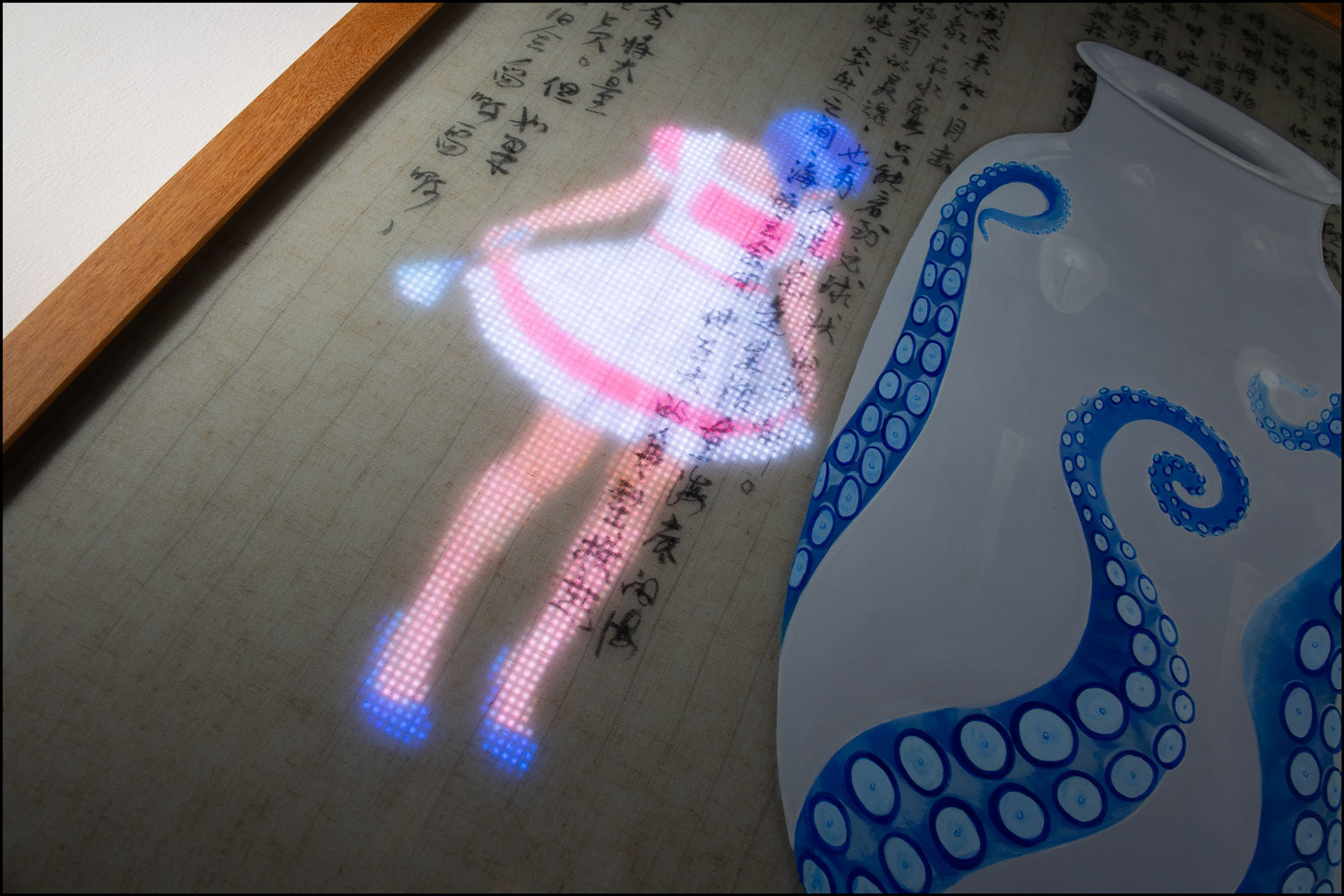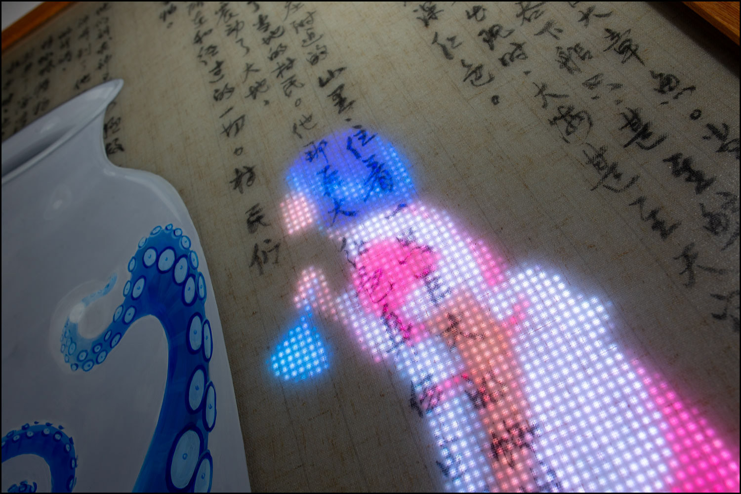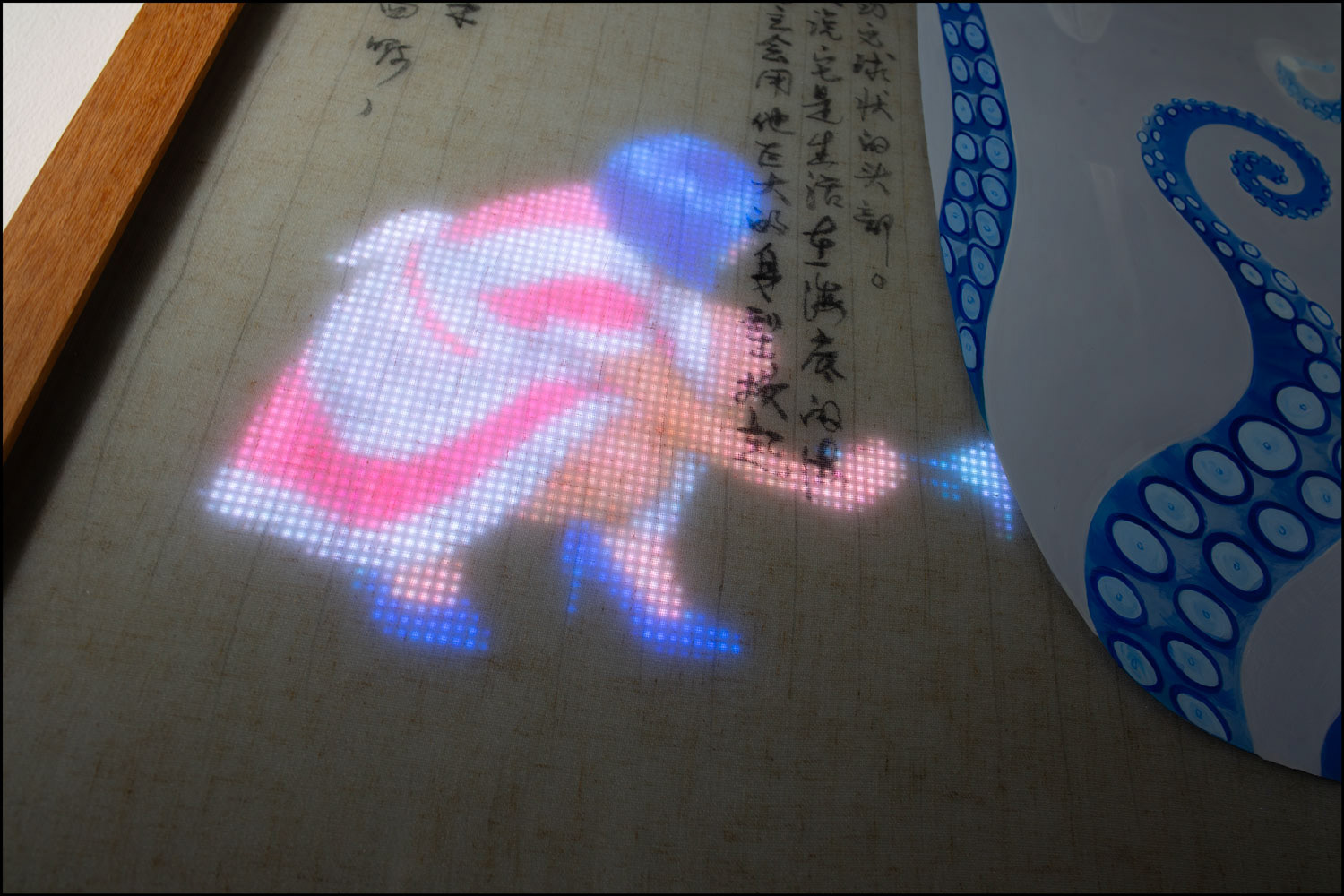 RGB LED display, Chinese ink on Vietnamese linen embedded in hand cast resin, teakwood frame