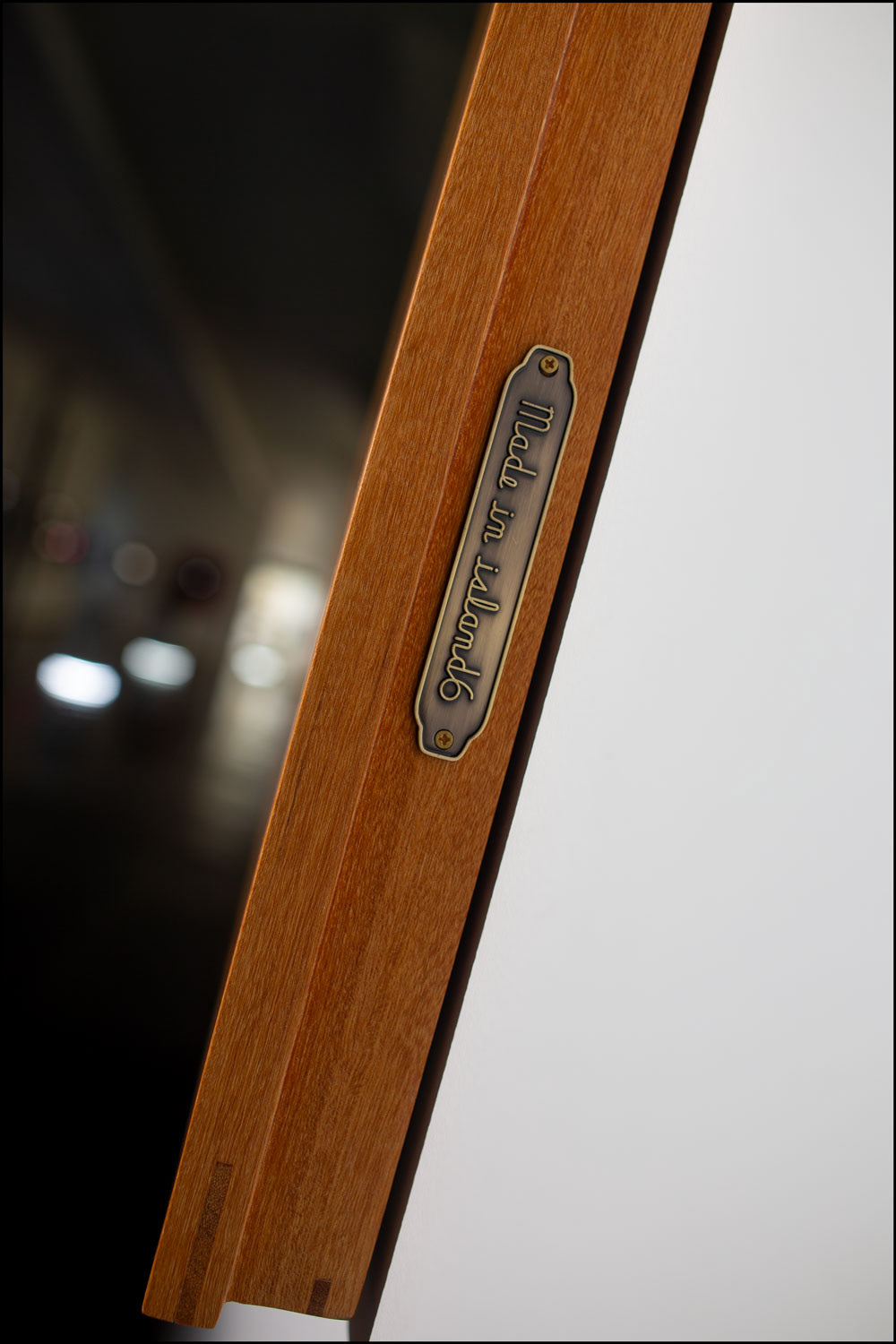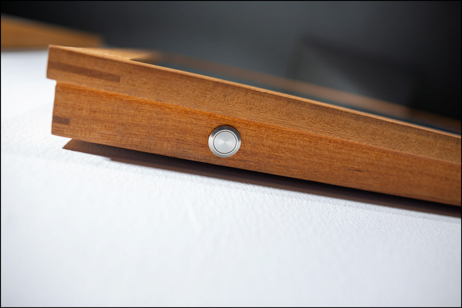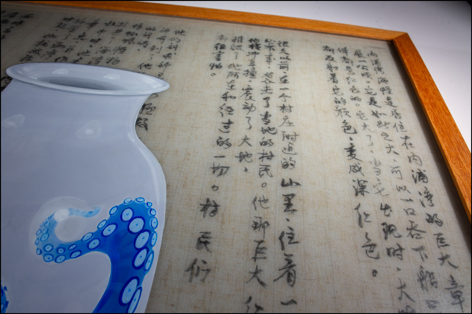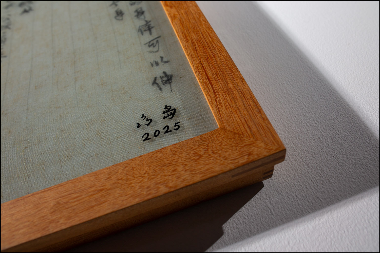 RGB LED display, Chinese ink on Vietnamese linen embedded in hand cast resin, teakwood frame