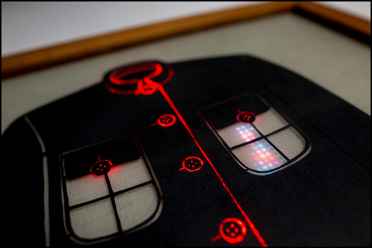 RGB LED display, Chinese papercut (Jian Zhi 剪紙) on Plexiglass, Vietnamese linen embedded in hand cast resin, teakwood frame